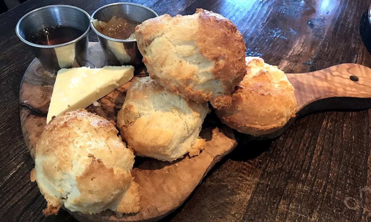 Biscuits are the best place to start at any Southern eatery. Here a rustic wooden board comes loaded with crusty, crunchy drop biscuits made with a recipe that Foster keeps close to the vest but that includes buttermilk. They’re light and fluffy on the inside, making it easy to eat all five. The board also comes with a generous slab of salted butter, local raw honey and housemade jam that changes regularly; this week happened to be lemon. “Each week we make a new jam, and it always has sweet and savory notes,” general manager Jake Louik points out. “This week was lemon, and we used the rinds to get a deeper flavor. And last week it was a cranberry-onion preserve.”