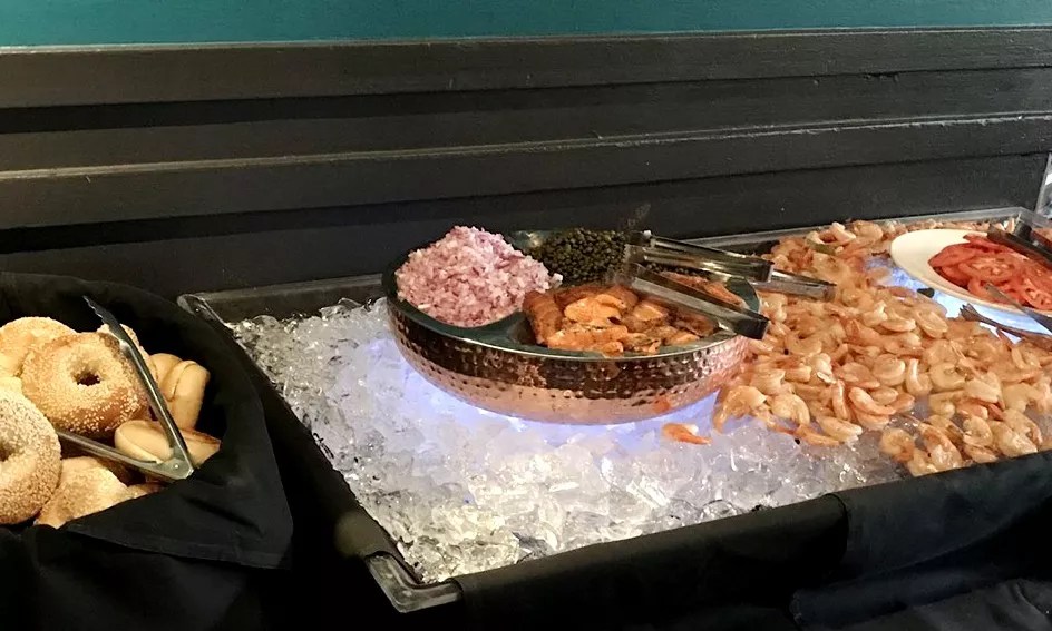 The salad bar has many options to upgrade your greens, the fruit platter is expansive, and a cheese board offers several tempting selections, so you can choose mixed nuts and grapes, for example, to supplement your cheese. Keep moving to find a bagel station with lox, capers and cream cheese, plus a bountiful pile of shrimp on ice just waiting to become the vehicle for your vat of cocktail sauce. And if you want a posh upgrade to your brunch, a pound of crab legs can be added on for $10.