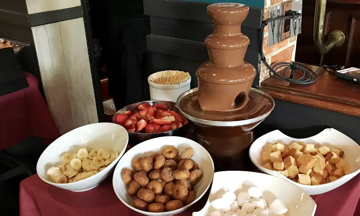 Last but never least is dessert. The tray of pound cakes, coconut macaroons and other pastries would be plenty, but front-of-house manager Katie Main didn’t think that was enough, so she added a chocolate fountain. Skewers are available to make kebabs of marshmallows, strawberries, banana, pound cake and doughnuts. Smoothies can also be made to order, with your choice of strawberries, bananas and pineapple with cranberry or orange juice. But if you want something a bit stronger, bottomless mimosas are $9 and Bloody Marys – with what amounts to a small charcuterie board atop – are $7 (you can get an unadorned Bloody for $4). Beyond those, a short list of brunch cocktails and standard mixed drinks are always available.