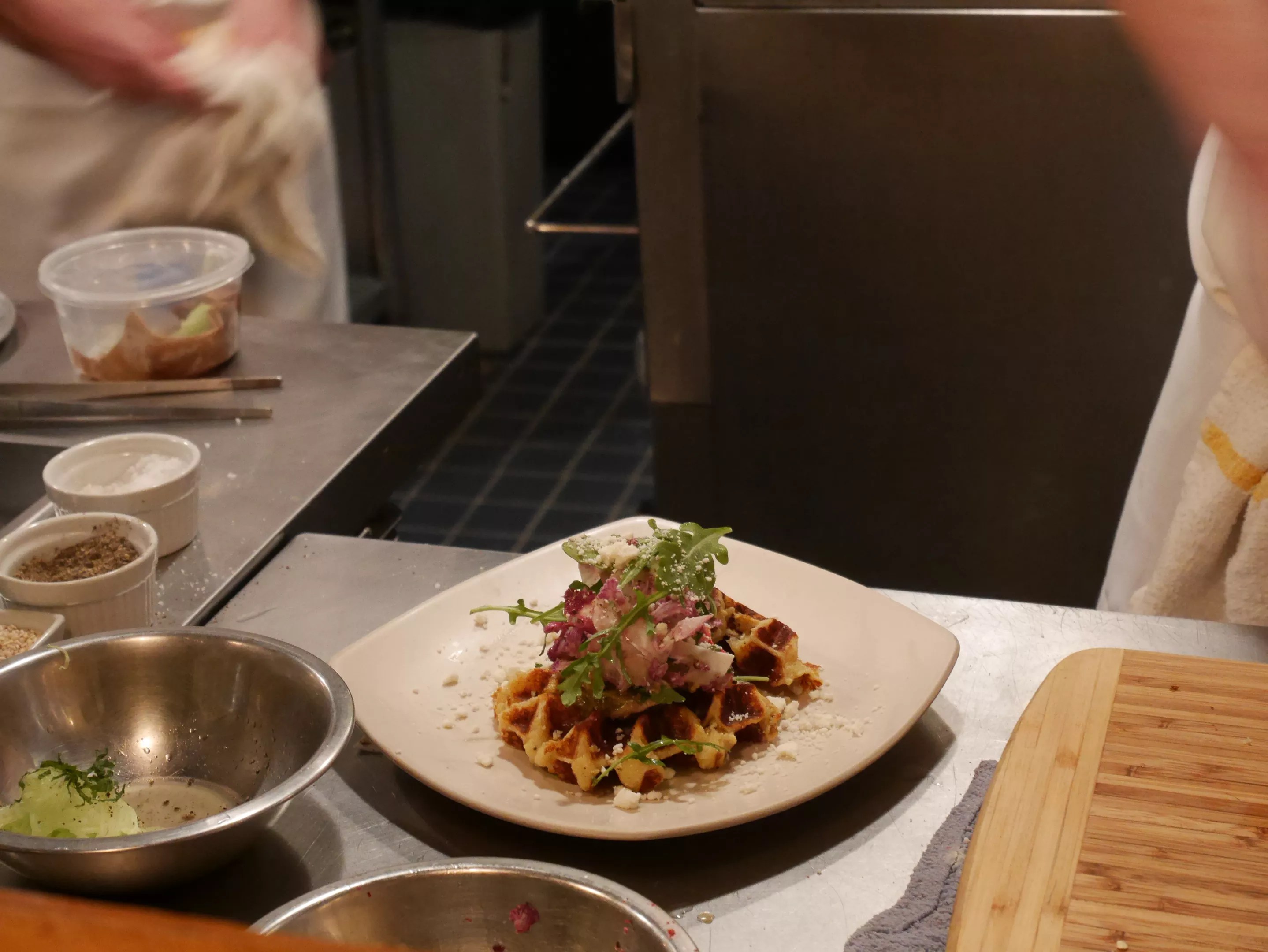 Wrap up the meal with the TTW “poutine,” which replaces the traditional French fries with a light, crusty waffle, which holds up well to a mound of pork shoulder and spicy tomatillo sauce. A cauliflower and arugula salad adds refreshing brightness to the dish.