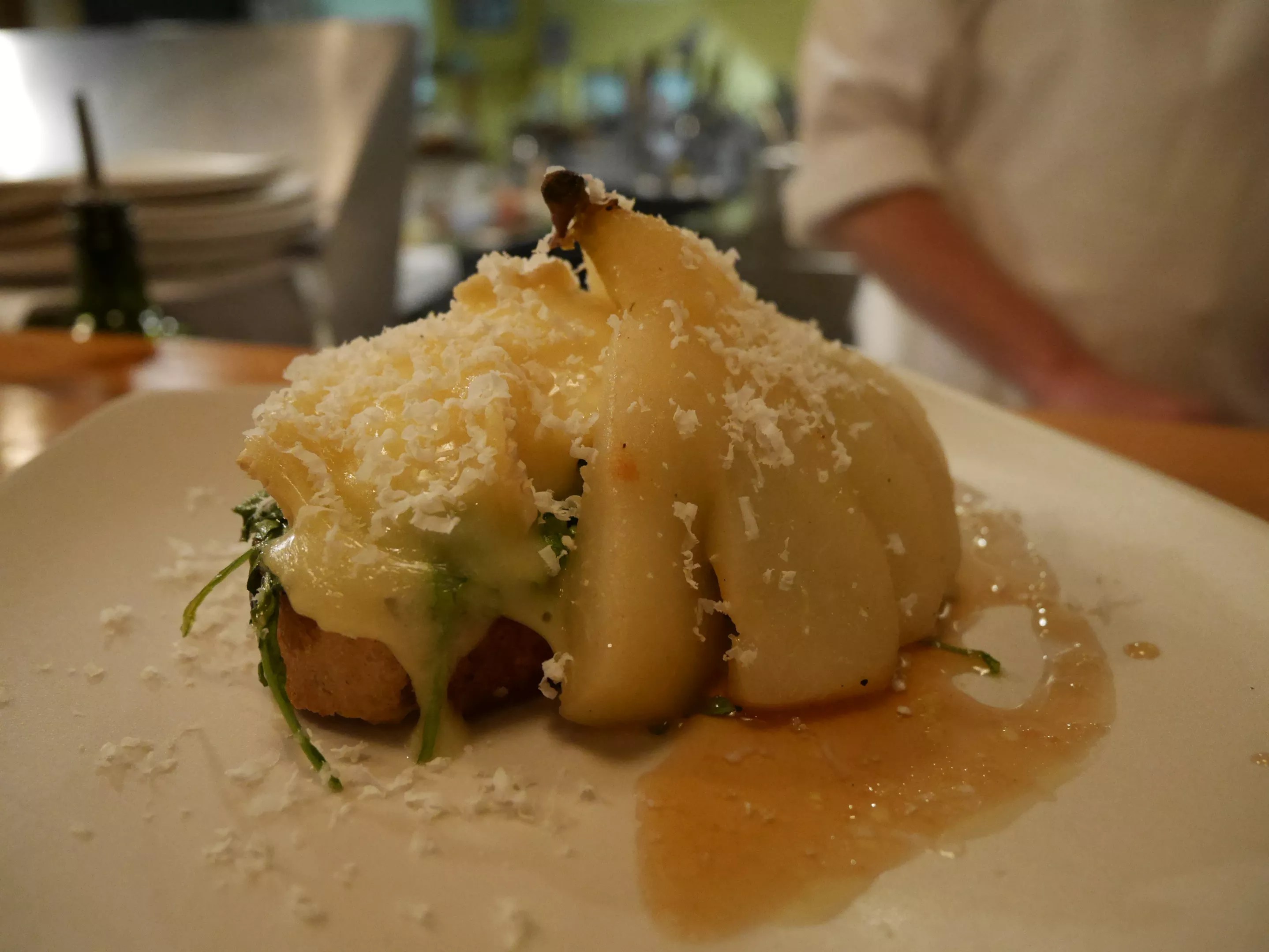 Order the bone marrow as the first appetizer; it’s rich and creamy and dissolves on the tongue. After you spoon the marrow out of the bone, you can use the bone as a luge for a shot of A.D. Laws whiskey (for an additional $6). Then, for a fruity change-up to the beefy marrow, order the poached Blake’s Pride pear. Slices of poached pears and arugula are placed on rye bread topped with brie melted to the perfect oozy consistency.