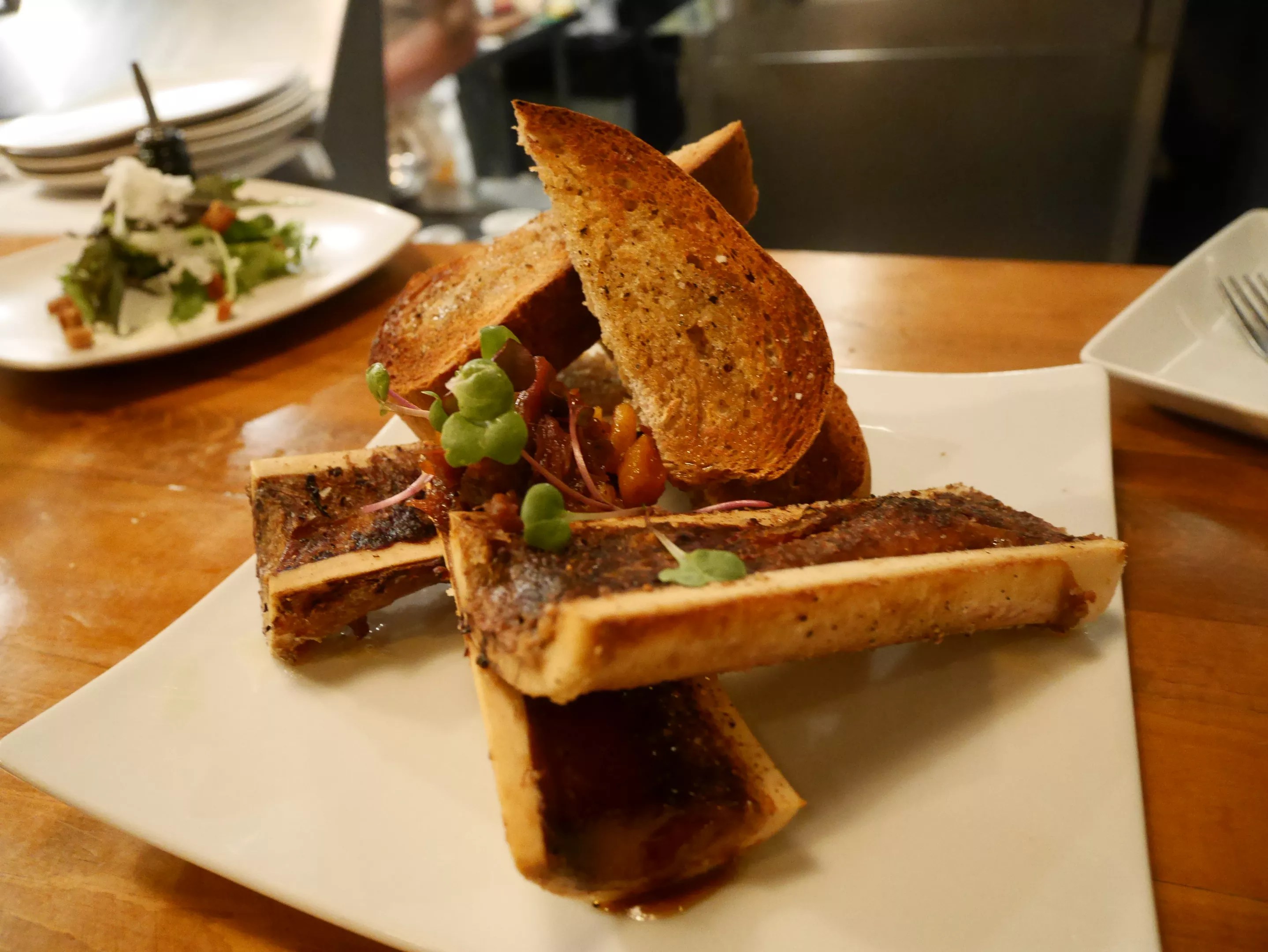 Decadent bone marrow that turns into fun when the bone becomes a shot luge.