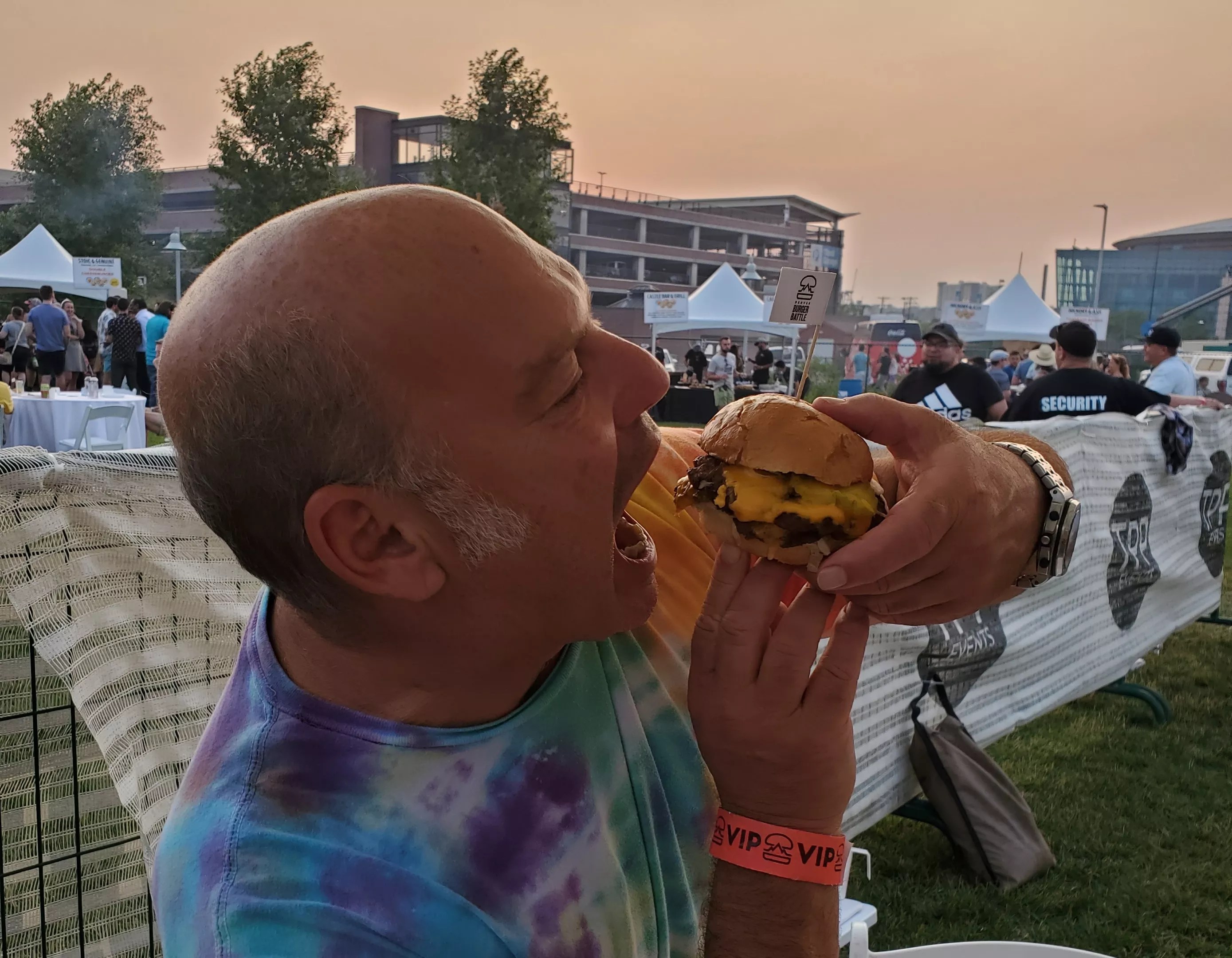 A giant inflatable hamburger, along with fifteen competitors and tables decorated with ketchup and mustard bottles, marked the site of the 2021 Denver Burger Battle on August 5. After judges and attendees consumed copious amounts of beef and buns, two burgers took top honors: Snarfburger’s classic double cheeseburger won Judge’s Choice, and the 2019 Judge’s pick, Cherry Cricket, took the popular vote this time with its 720 Jammin’ Poblano Burger, with pimento cheese, a crispy panko-crusted roasted poblano, grilled pork belly and raspberry jam.