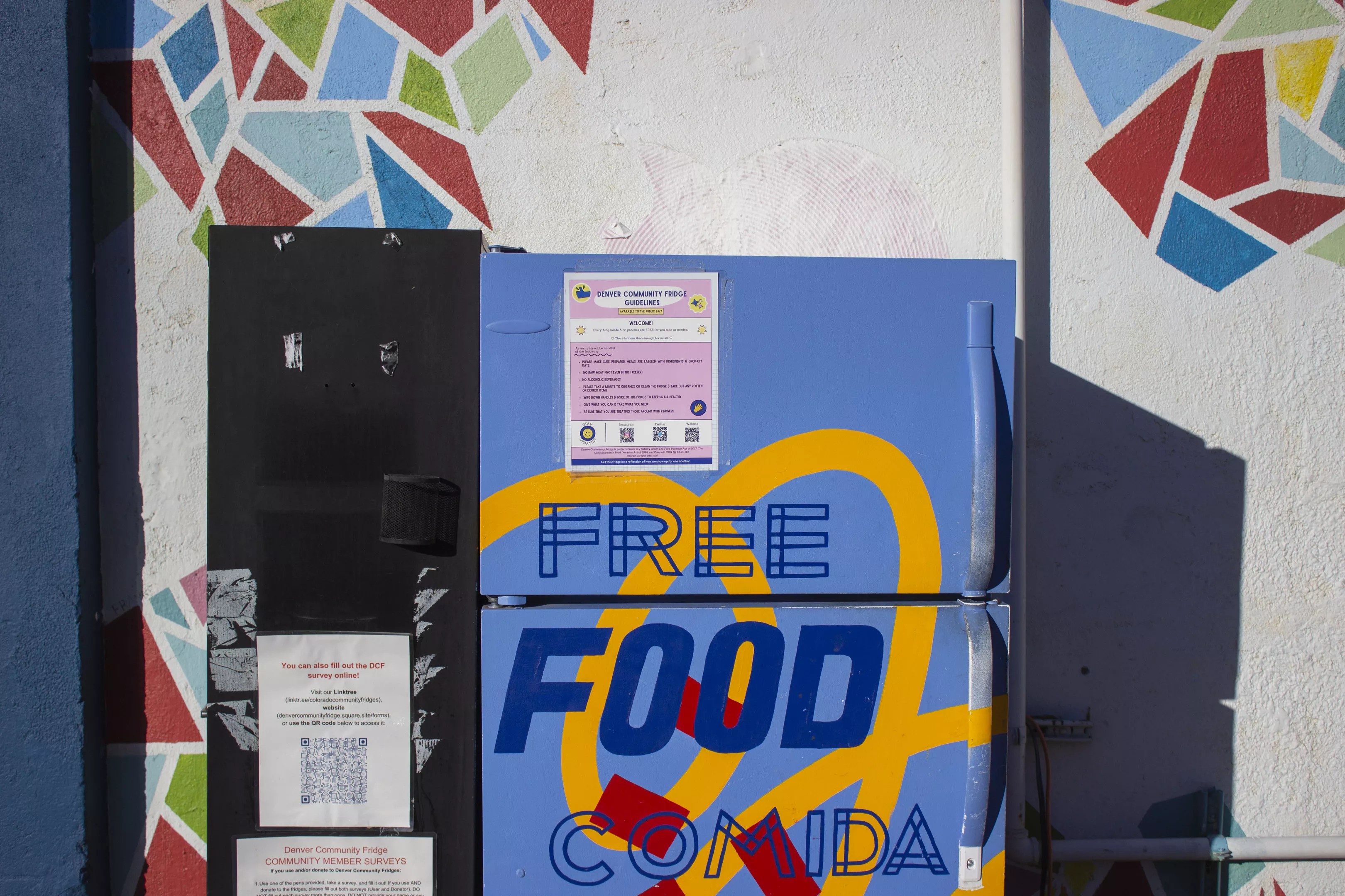 Huckleberry Roasters, at 4301 Pecos Street in the Sunnyside neighborhood, was one of the first to host a fridge. Co-owner Koan Goedman explains that DCF reached out to the coffee shop to host, and he immediately agreed. He saw a “healthy connection [between] how Huckleberry operates and how these fridges operate: kindness and empowerment rather than shaming and making obstacles of people,” he adds.