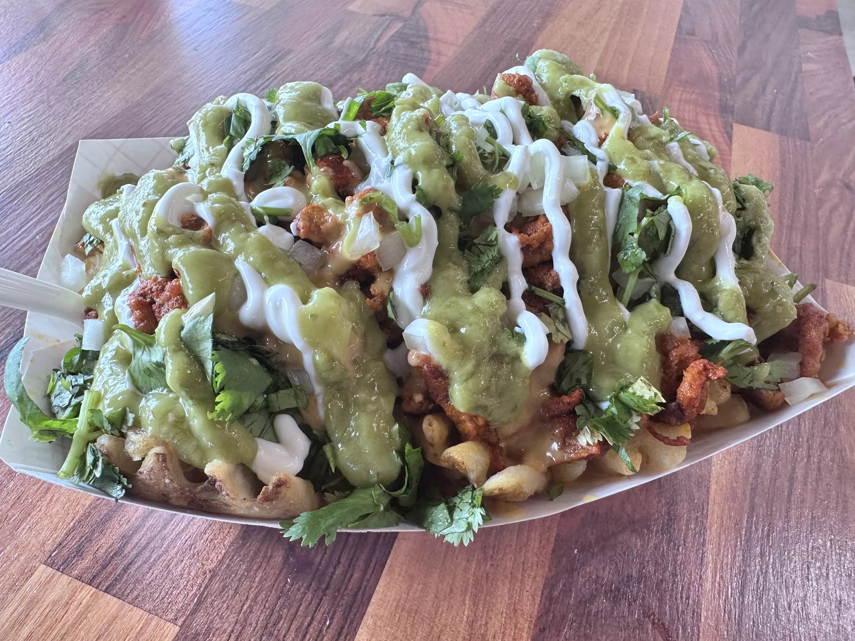 Talavera offers loaded waffle fries loaded with nacho cheese, cilantro, onions, guacamole, sour cream and a choice of meat.