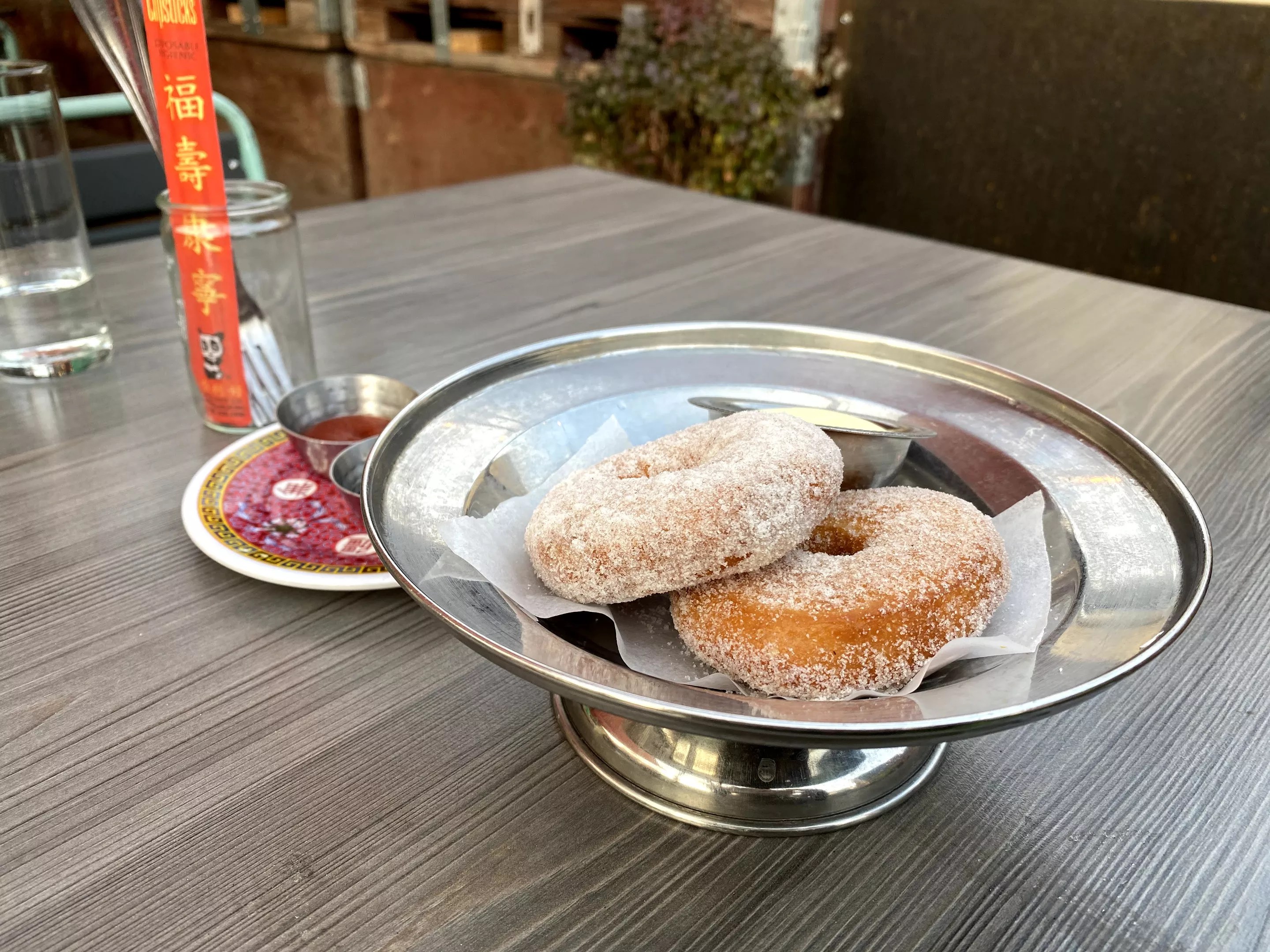 After some heated discussion about the large variety of happy hour offerings, we decided to start with two bao doughnuts ($1 each), because if there’s one thing we agree upon, it’s pastries. The sugared discs arrived freshly fried with a side of pudding-like crème Anglaise, and although I found nothing especially bao-like about the dough, and the Anglaise didn’t have much of the promised lime-leaf flavor, the Chinese five spice in the sugar dusting came through — but not so much that if you’re sensitive to anise flavors you’d really mind.