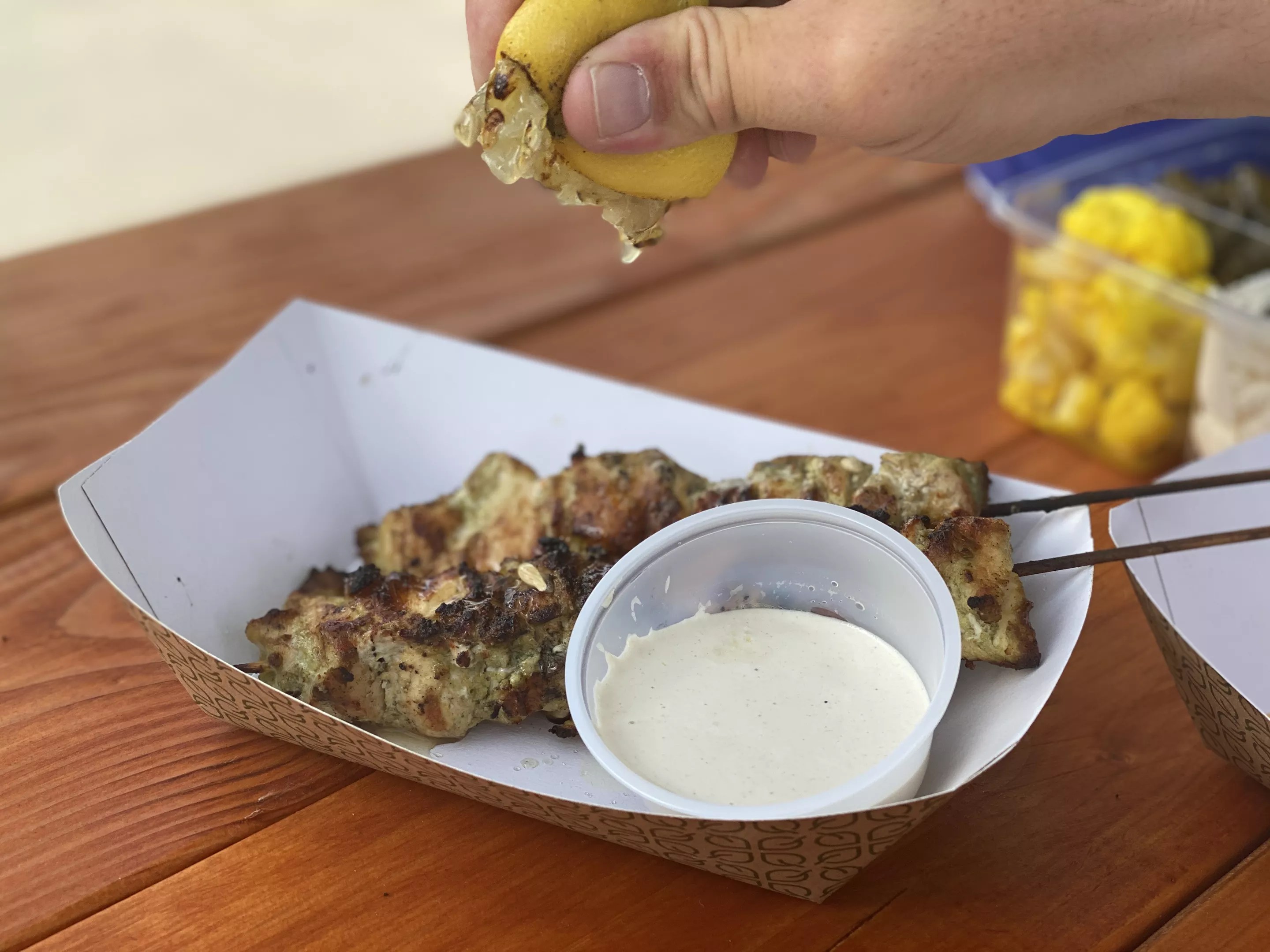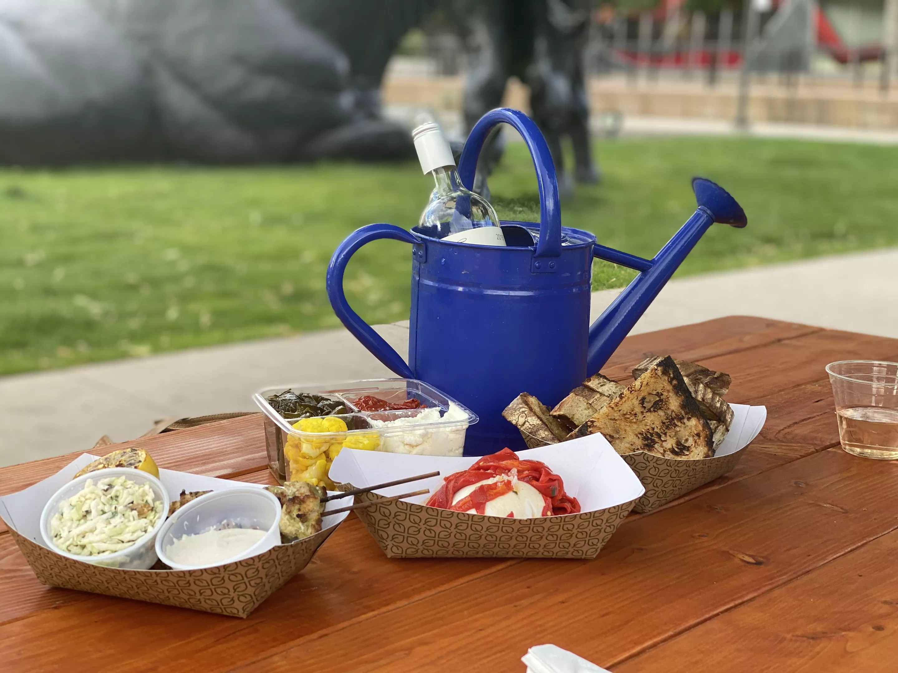 The wine arrived in a quaint watering can filled with ice water, along with three plastic cups. Next came the tasty chicken kebabs, neither too dry nor particularly moist, accompanied by a grilled lemon and tahini dipping sauce. We shouldn’t have been surprised to see everything arrive in paper boats and plastic containers; we realized that we were trading style for safety – and it also makes it more feasible to grab everything to go should you want your picnic at home. Leigh Chavez Bush