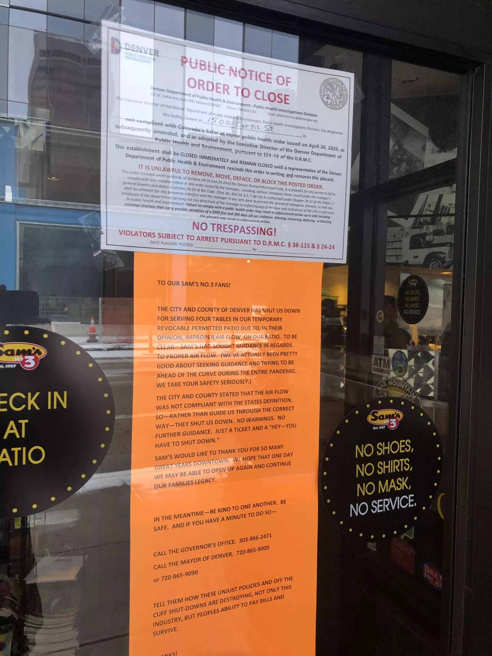 The City and County of Denver has shut us down for serving four tables in our temporary revocable permitted patio due to, in their opinion, improper air flow, on our patio. To be clear — Sam’s had sought guidance in regards to proper air flow. (We’ve actually been pretty good about seeking guidance and trying to be ahead of the curve during the entire pandemic. We take your safety seriously.)