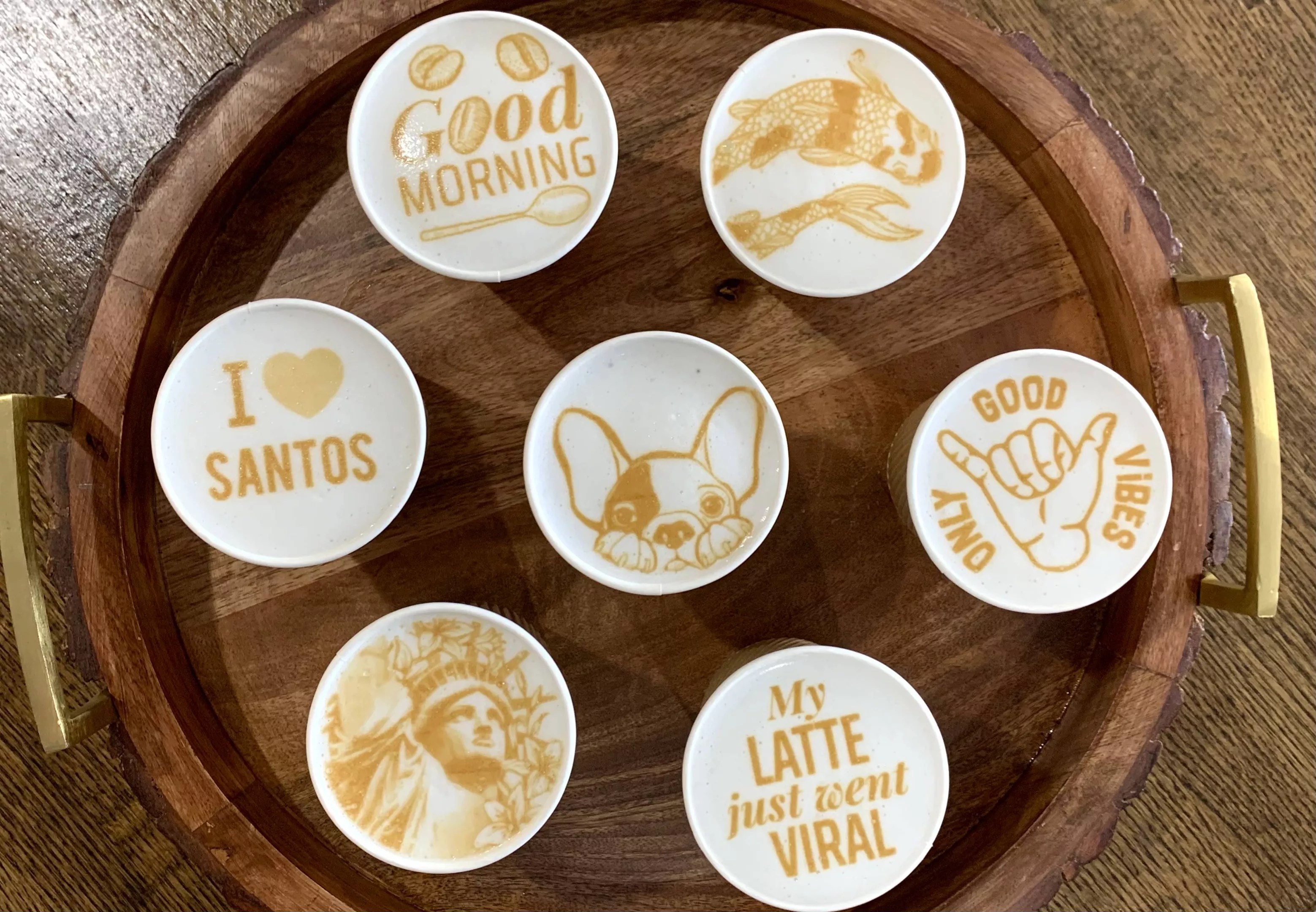 A variety of latte foam art at Santos Café and Grill, including the very popular puppy selection.