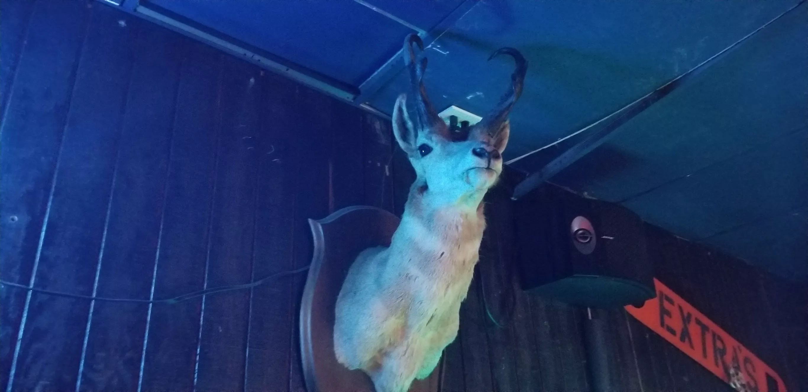 Corrugated steel and reclaimed wood – attempts at modernizing the bar – mixed with standard dive bar elements: threadbare carpet and a random assortments of chairs. One of the regulars, a metal fabricator, has contributed decorative touches, including a large tin man statue. Other random decorations – military flags, sports memoralia, an antelope head – all had back stories that in some way honored other regular customers. Packers fans are welcome at Extra Innings, according to this tin man and his dog companion. Sarah McGill