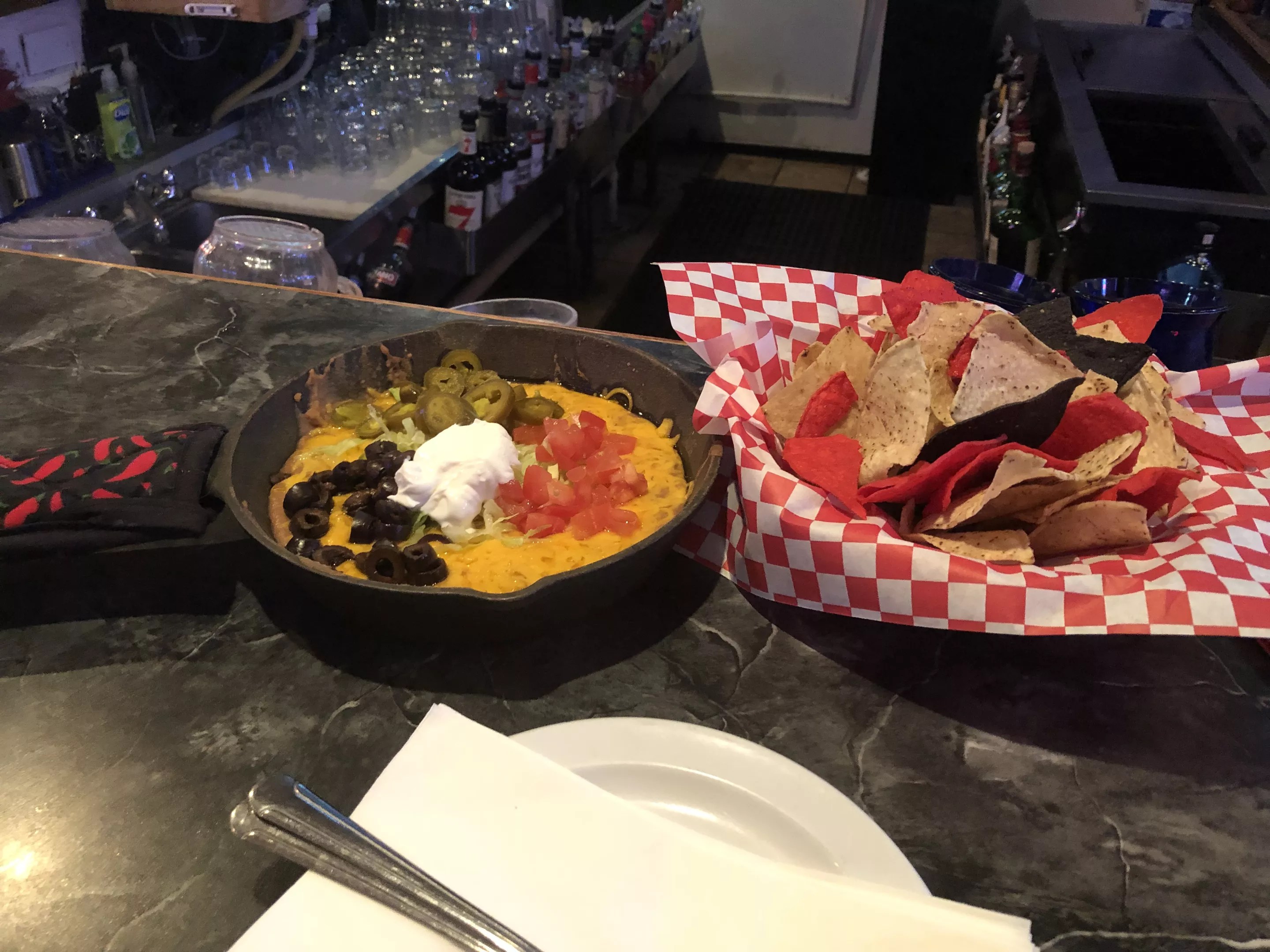 Aurora is home to Dry Dock Brewing Company, which fills several tap handles at Pitchers. So you can order a “Hopricot” here, a Dry Dock-approved mix of Apricot Blonde and Hop Abomination IPA. The food menu is extensive and includes breakfast served all day, every day, which was tempting, but we opted for the skillet nachos. Rather than fully constructed nachos, these come as a basket of tortilla chips and a cast-iron skillet filled with layers of refried beans, melty cheese, sour cream, jalapeños, black olives and tomatoes. While not your standard nacho setup, it does allow you to scoop the perfect amount of toppings with each chip. Skillet nachos for the win! Sarah McGill