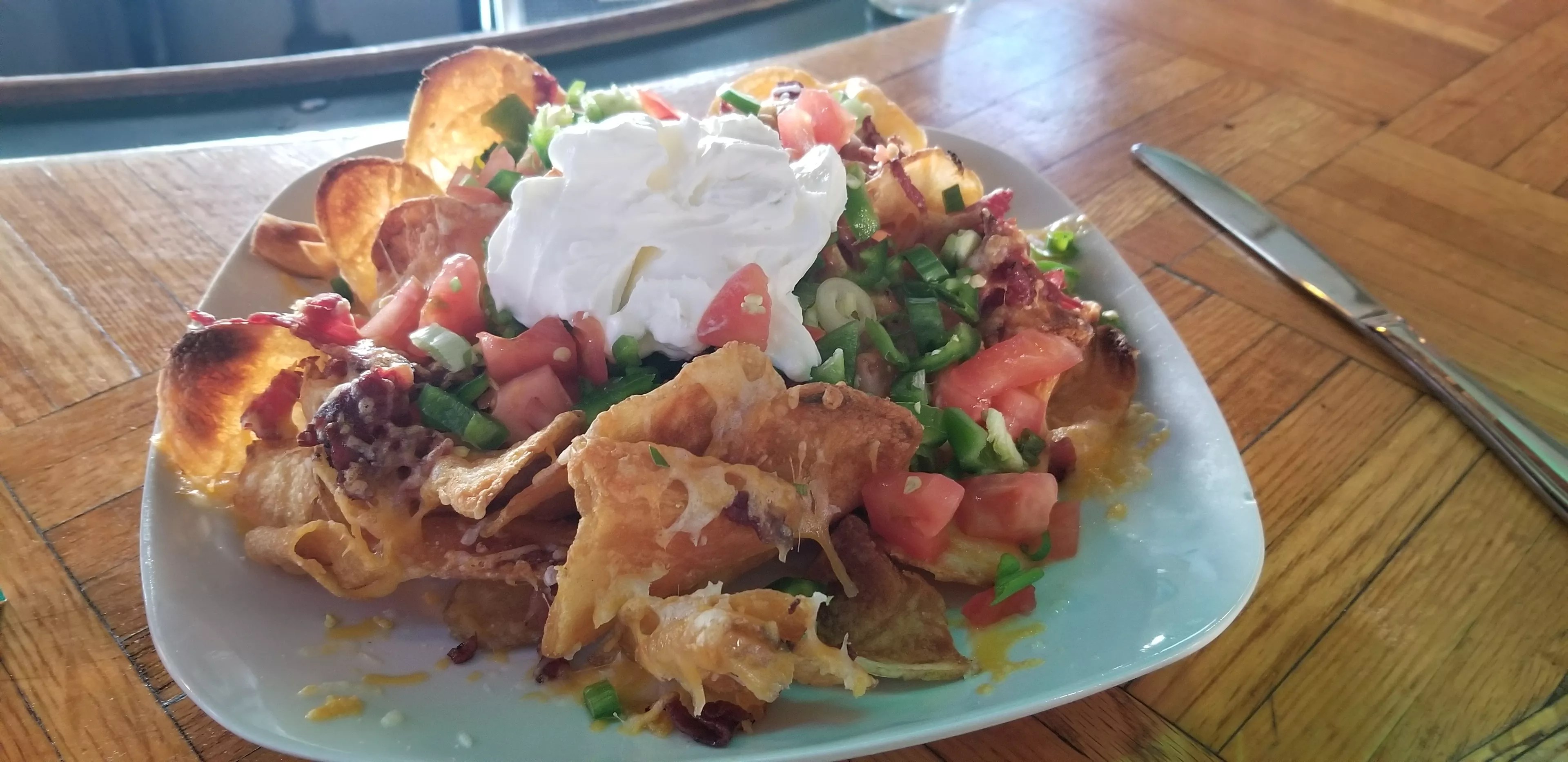 Like the Quinlivan family, Q’s is Irish, and celebrates the fact with some traditional pub fare: fish and chips, patty melts and Irish nachos, to name a few. I’ve developed the habit of ordering Irish nachos at most Irish bars I visit, and this version came out as an enormous plate mounded with crispy potato chips (hand-cut and fried, by the looks of them) topped with ample cheese, corned beef and sour cream, plus diced tomatoes and onions.