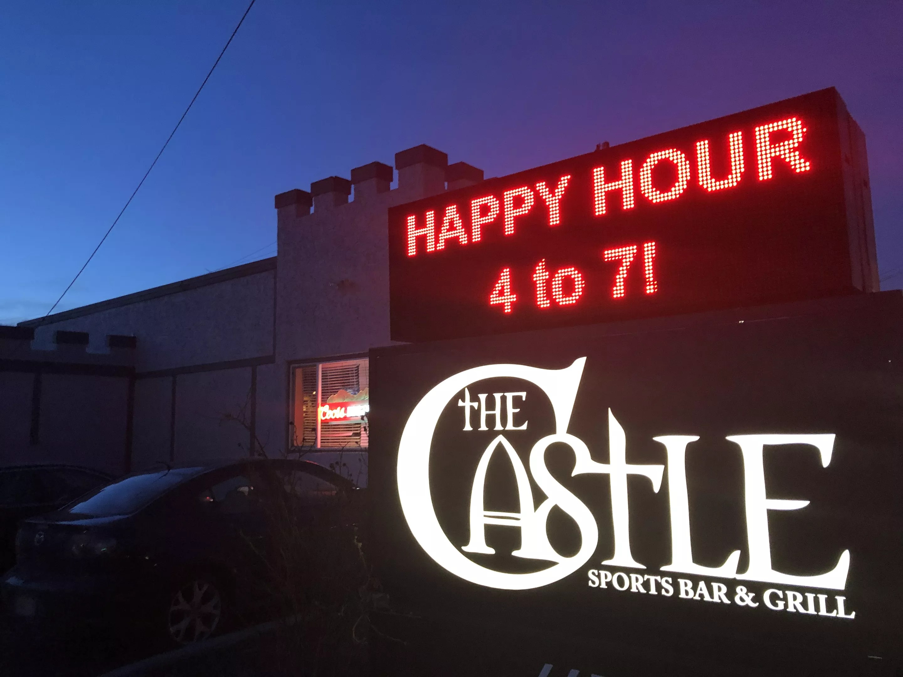 A friend and I arrived ready for some grub and happy-hour drinks on a Monday night. The Castle’s parking lot was already getting full, but we managed to snag a spot and took in the building’s lovely stuccoed castle architecture. “Happy Hour 4 to 7!” the large scrolling LED sign proclaimed; a quick glance at the clock indicated we were just in time. A couple making out at a booth in the window didn’t seem too concerned about ordering more discount drinks, though.