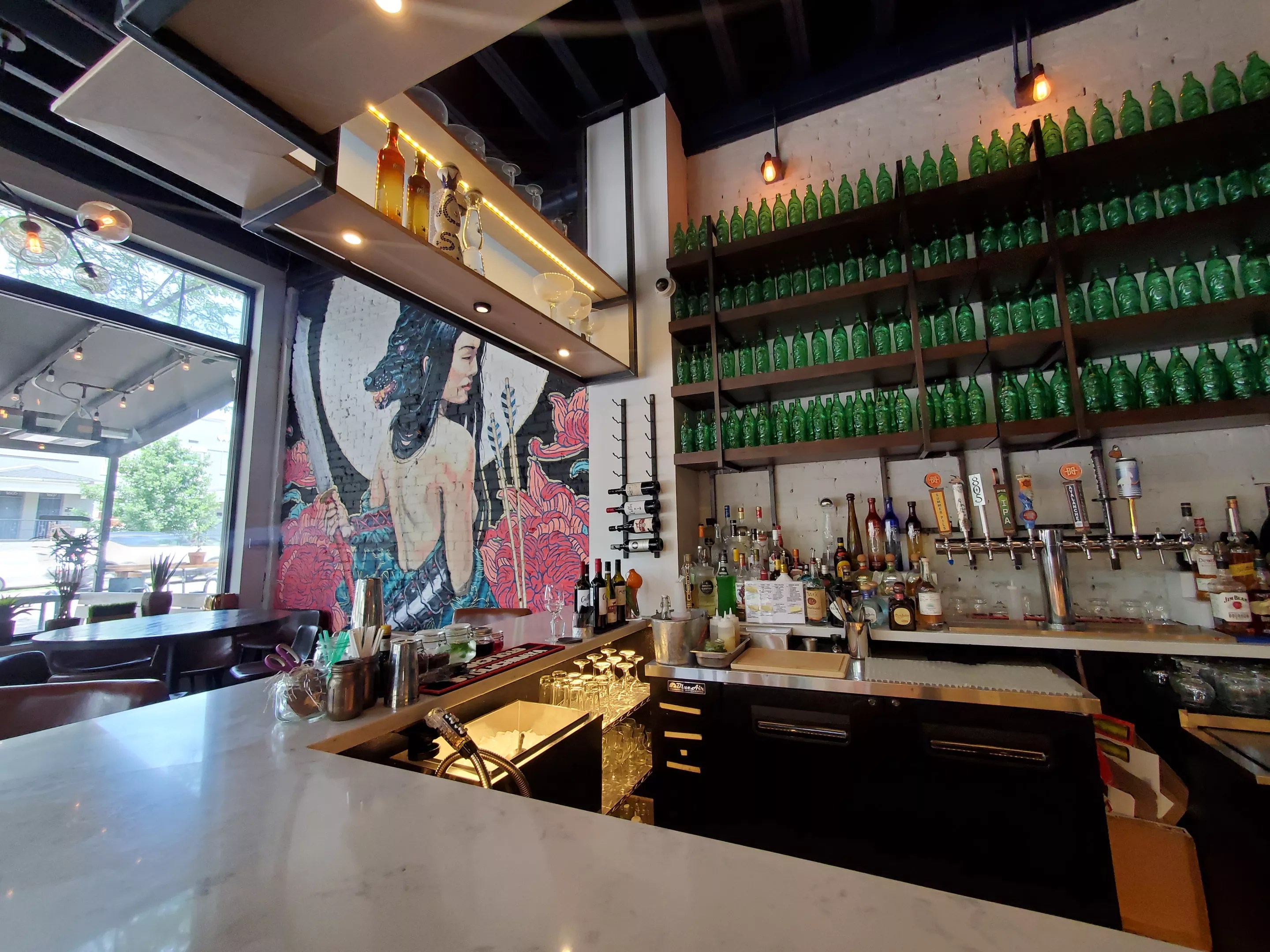 Two days later, I arrived right as the restaurant opened (1 p.m.) and was the first guest of the day. The space is airy and inviting, with ample outdoor seating. I chose a place at the bar, in front of the shelves filled with empty green Lucky Buddha beer bottles; on the wall to the left is an eye-catching mural by Jon Pucci. As its name implies, Pho & Bar does indeed have a full bar with house cocktails (the Lychee Mule was tempting, but I stuck with water), wine, beer and sake.