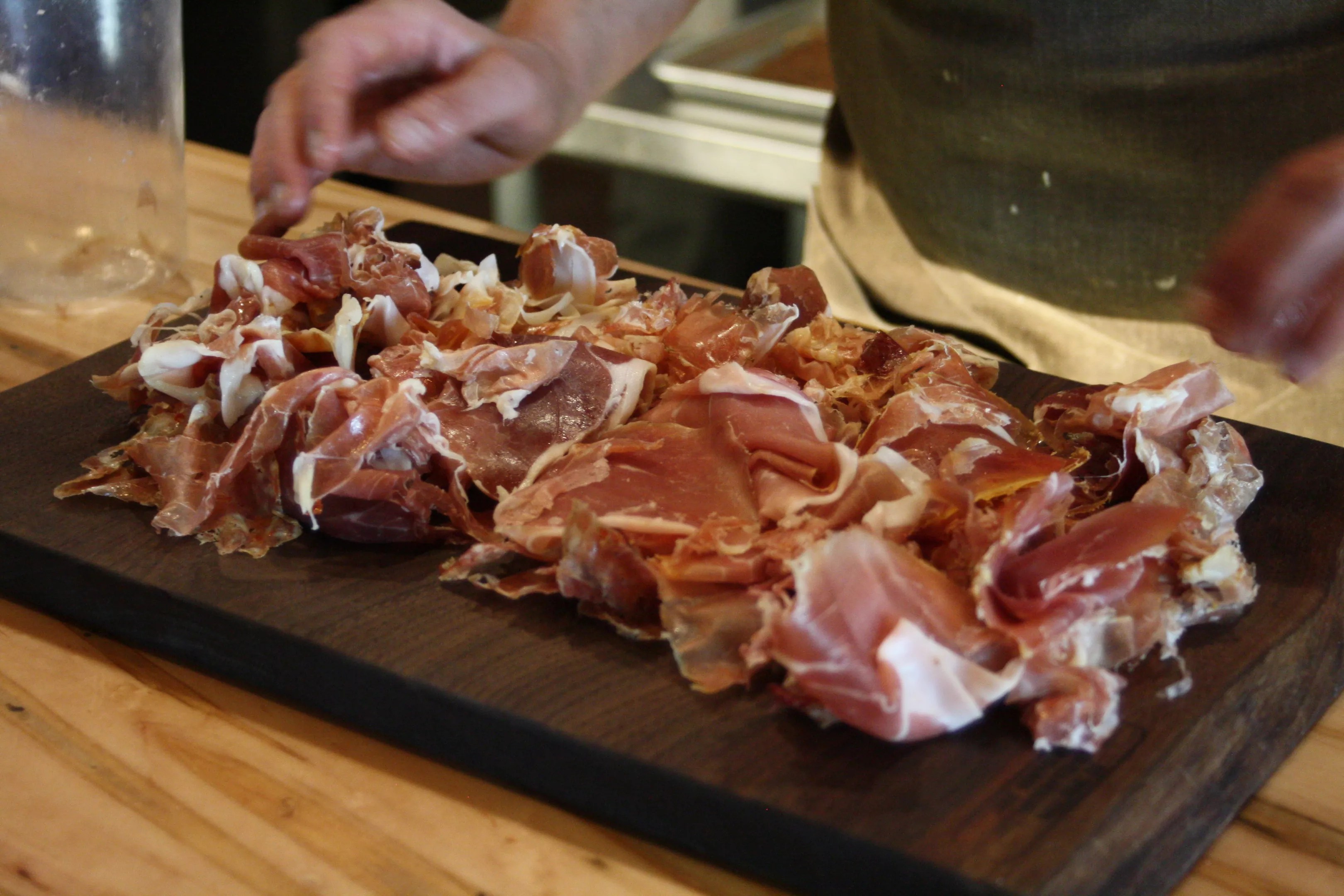 Chef and co-owner Anthony Lopiccolo pulls out a sample of the charcuterie scraps he uses to make the his ramen broth.