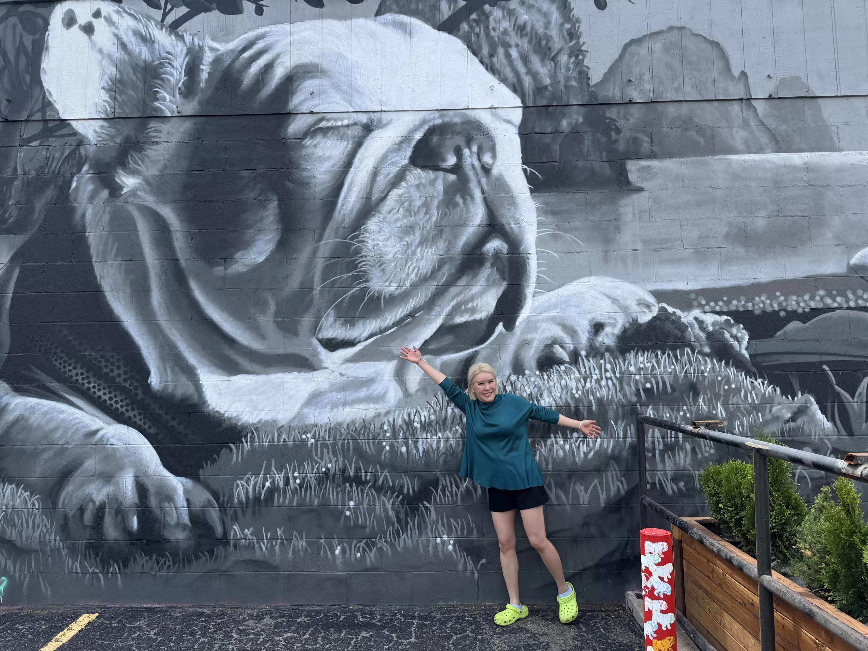 Kamolrat “Ploy†Limpapath in front of the mural on the side of her building done by Patrick Kane McGregor