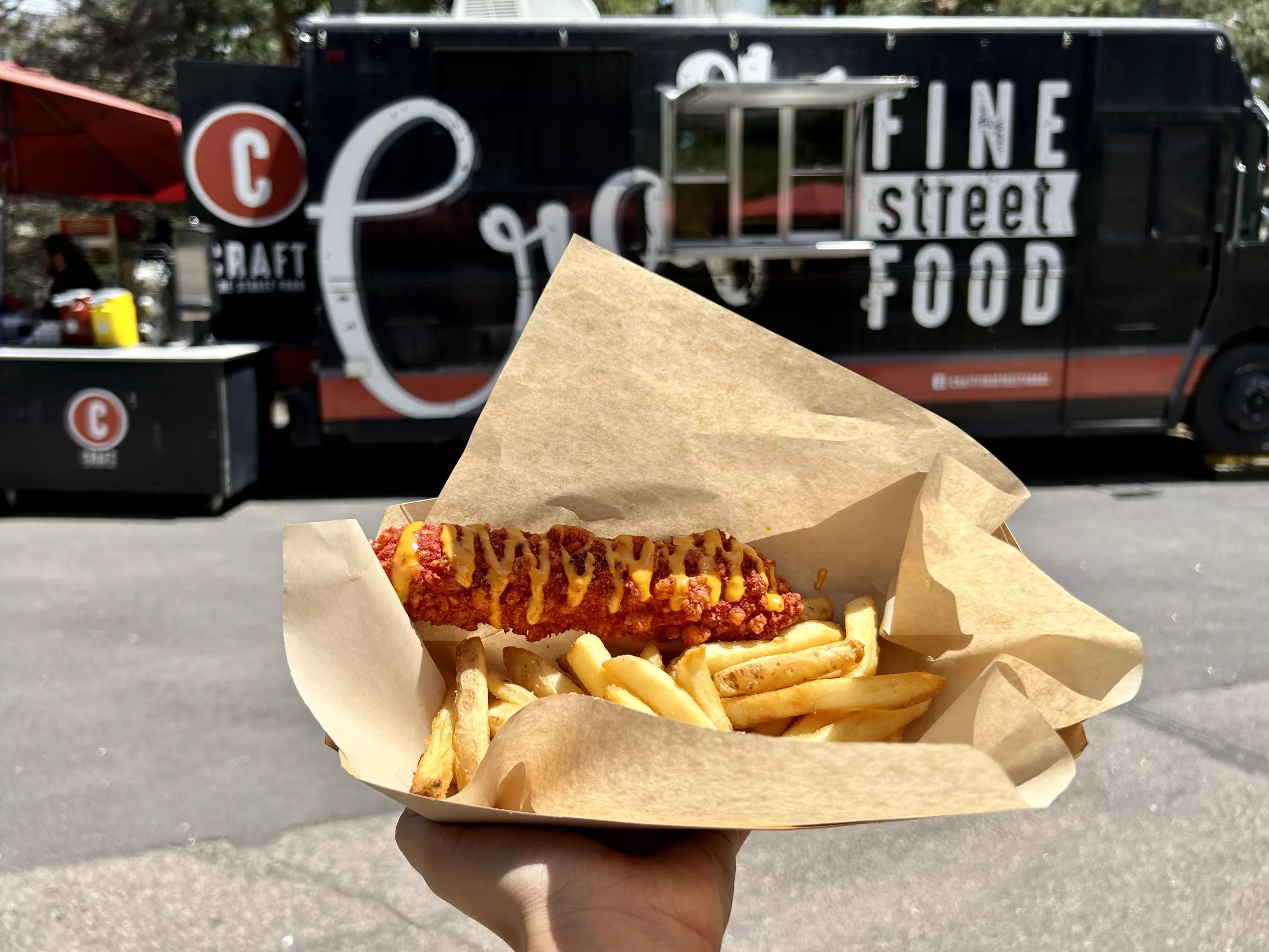 Other options at Craft Fine Street Foods include the Crispy Rice Dog and the Flaming Hot Dog, which is half beef, half mozzarella cheese, rolled in Flamin’ Hot Cheetos and drizzled with spicy mayo.