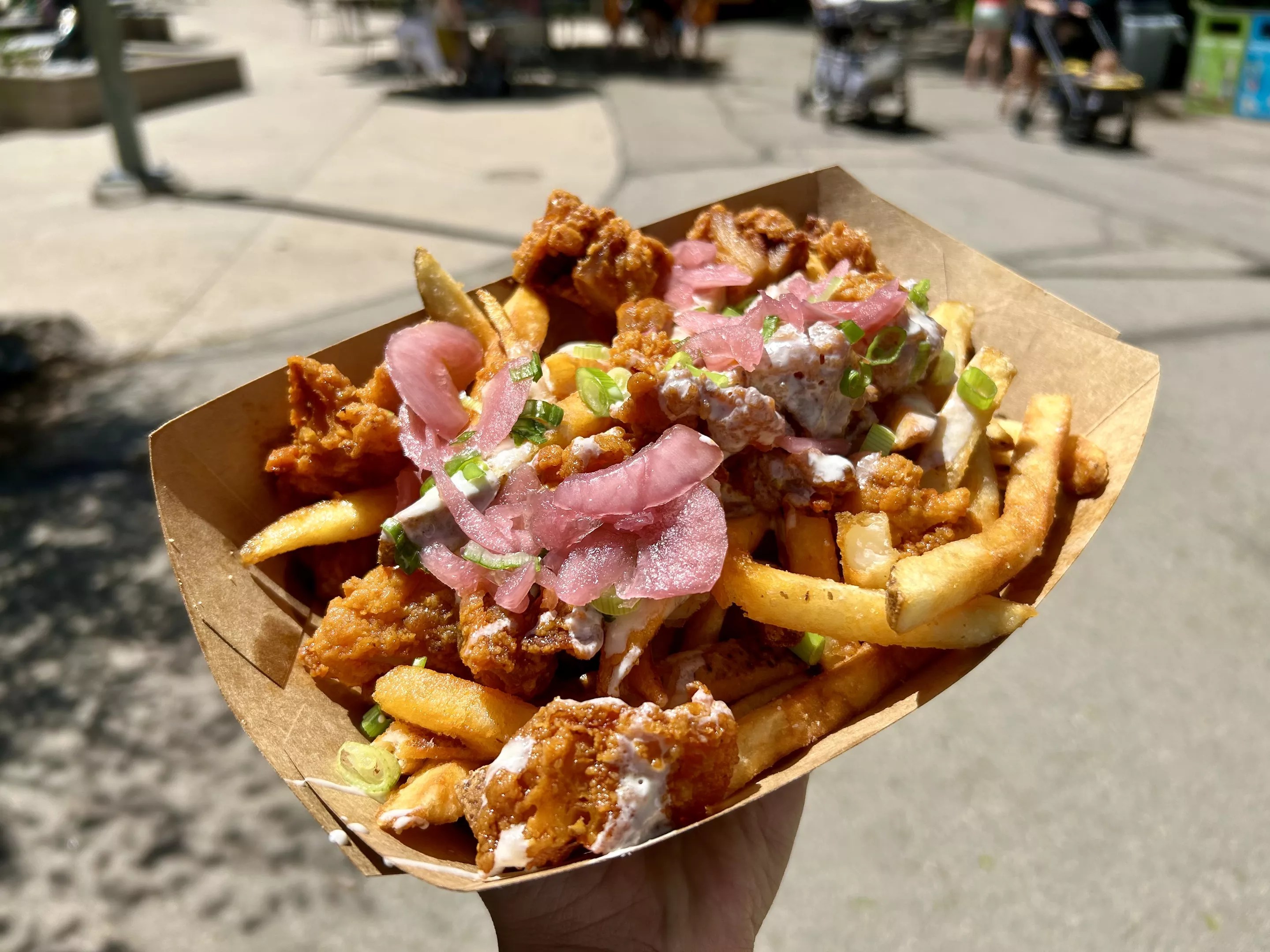 The mobile food concept specializes in hot chicken, served in the form of its top seller — garlic fries loaded with crispy chicken nuggets, white queso, green onion and pickled shallots — and in towering sandwiches with slaw and charred-onion ranch.