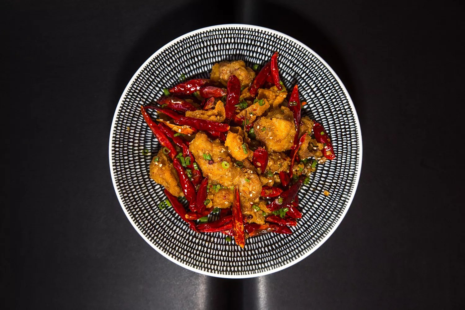 At Meta Asian Kitchen, Kenneth Wan and Doris Yuen have assembled a tight and modern slate of snacks and entrees perfect for Avanti’s heated patios or a take-home feast. But the food is all founded on tradition, whether it’s handmade, pan-fried chicken dumplings or the spicy Sichuan wings served with blazing-hot Tony’s sambal (which you can purchase separately). Amid the bao buns and fried tofu skewers, the standouts are the stir-fried beef noodles, the Hong Kong-style cha siu rice plate, and the unique Sichuan rice cakes with sauce-coated potatoes. Chong Qing chicken at Q House. Danielle Lirette