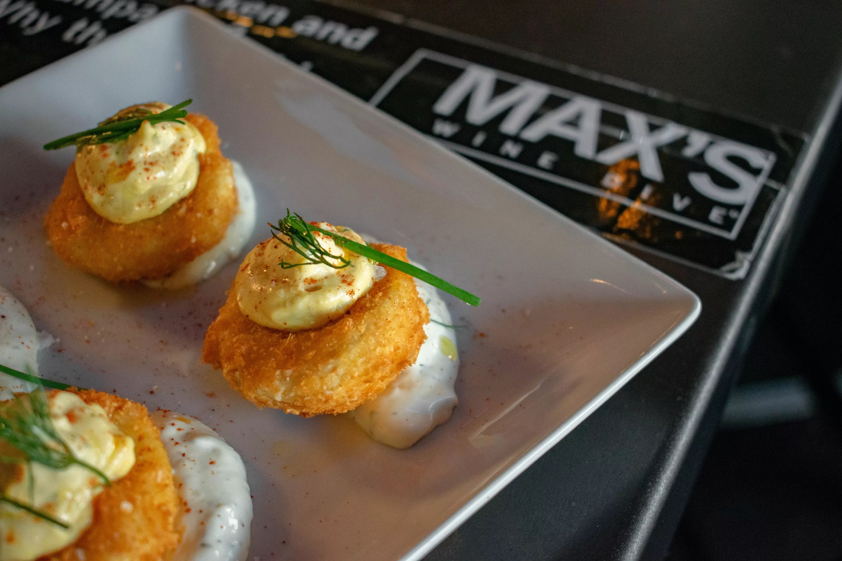 Fans of the classic deviled egg will love chef Brian Vaughn’s version at this LoHi eatery. Each order of four comes topped with crunchy, Abita beer-spiked mustard seeds, pickled celery and a nibble of Benton’s country ham. It’s two of the best things from the South highlighted in one little bite of creamy, savory goodness. In fact, these represent just the right balance of tradition and chef-y touches; you might want to take a page from Vaughn’s repertoire to add some flare to your next batch. lowrestaurant.com Deep-fried deviled eggs are a popular appetizer at Max’s Wine Dive. Max’s Wine Dive