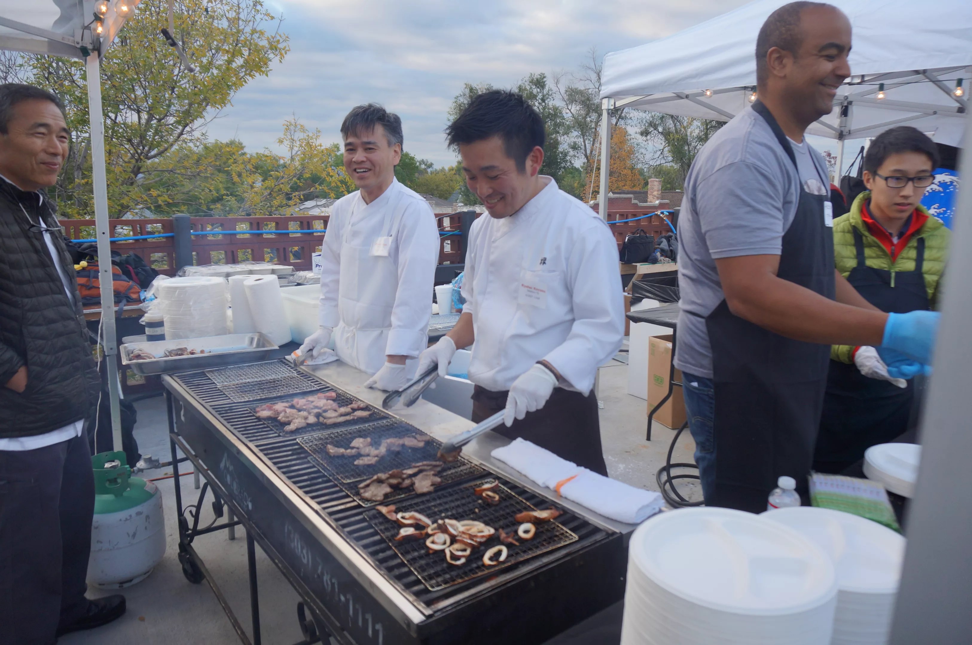 Sunday, June 24 Toshi Kizaki, left, looks on as beef and squid are grilled. Mark Antonation