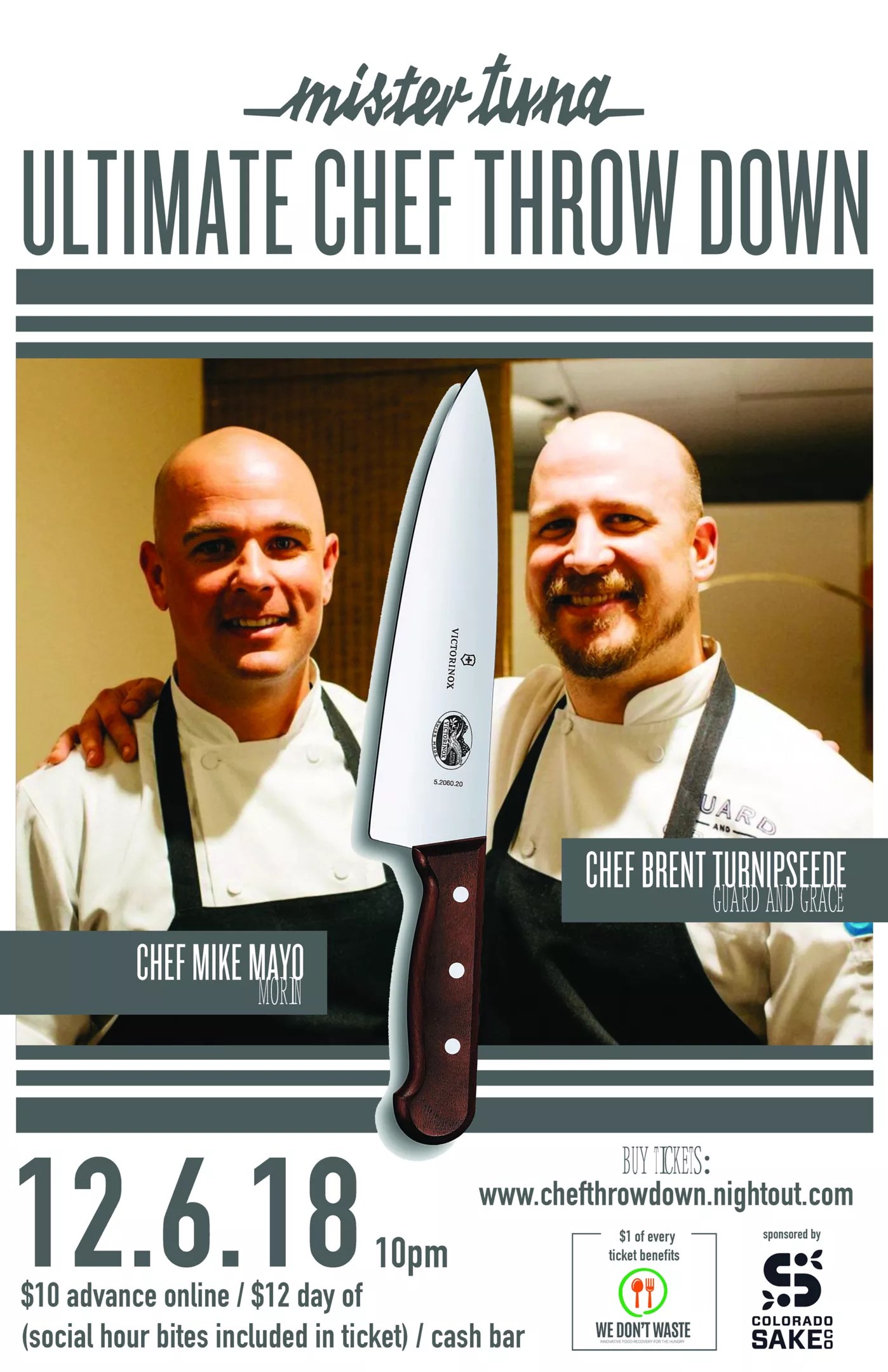 You can sit around in your yoga pants and watch reruns of Chopped, or you can get cleaned up and step out for a night of food and competition Denver-style. On Thursday, December 6, Mister Tuna (3033 Brighton Boulevard) is hosting its Chef Throw Down, where chef Brent Turnipseede of Guard and Grace and chef Mike Mayo of the brand new Morin will battle it out in a rapid-fire culinary competition. This will be a late-night showdown beginning at 10 p.m., when the chefs will create dishes using three surprise ingredients. The event is sponsored by Colorado Sake Co. and a portion of each ticket sale will be donated to We Don’t Waste. Tickets, which include bar bites during the event, are $10 if you buy them in advance at chefthrowdown.nightout.com, or $12 at the door. Drinks will be extra so bring a little cash.