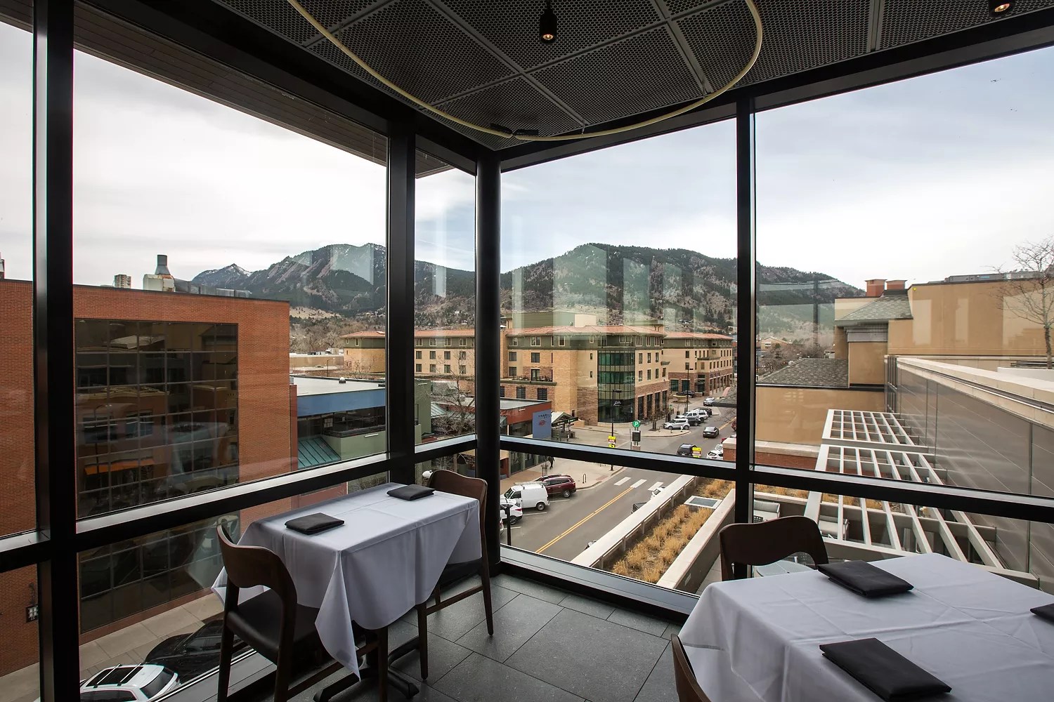 Chef’s counters can be a little intimidating, the salumi bar a little confusing. But everyone loves cheese, so a seat at Coperta‘s mozzarella bar is just the thing for a cozy night of comfort food done Italian style – with an extra dose of hospitality. Choose from buffalo-milk mozz from Campana or domestic, hand-stretched cheese made from Wisconsin dairy (or just get them both), and supplement with suppli al telefono (cheesy rice balls), senise peppers and spaghetti carbonara. Perfect for: an indulgent night with boisterous friends. copertadenver.com Corrida’s view of the Flatirons. Danielle Lirette