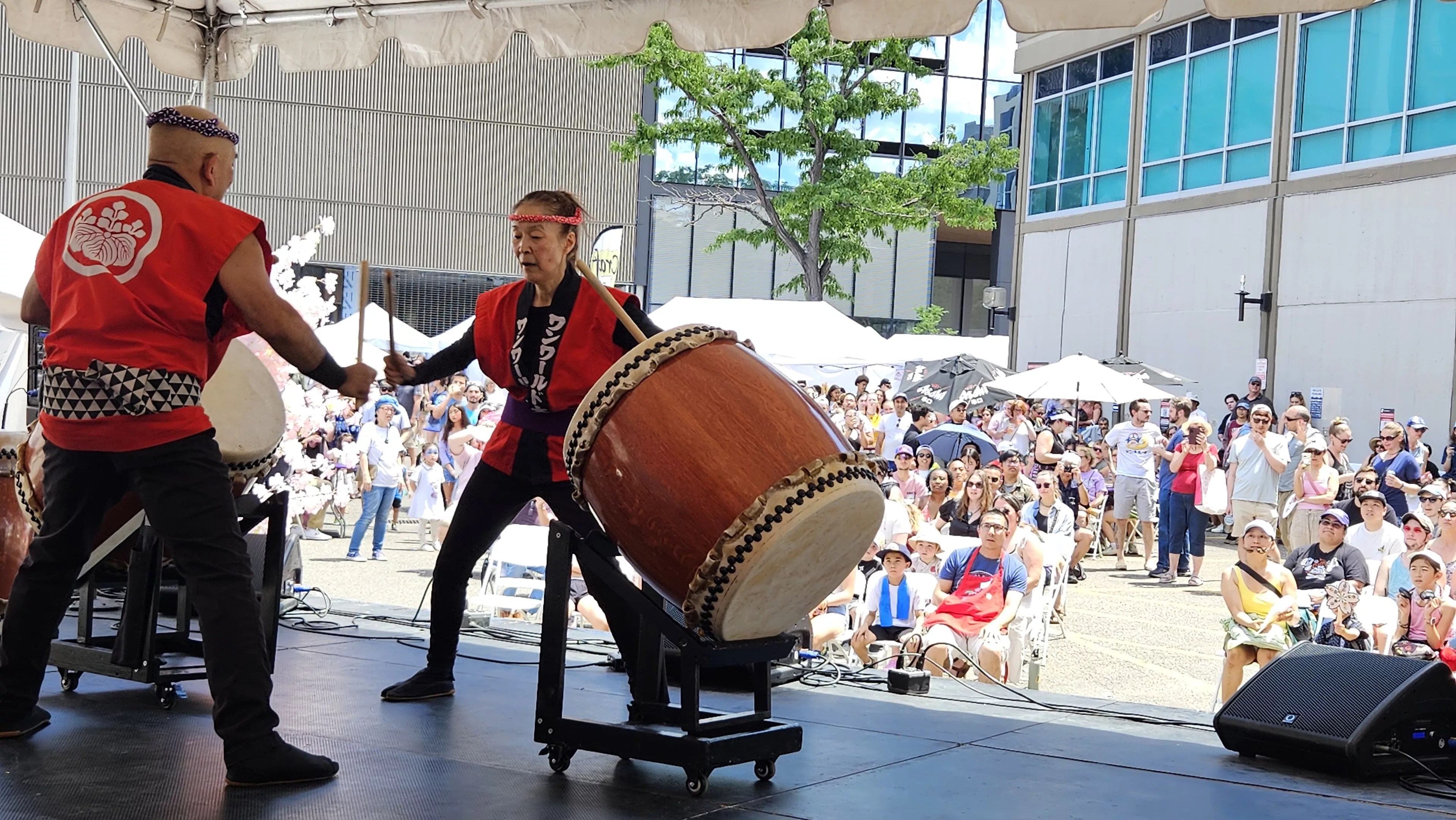 Japanese taiko drumming showcased on stage at the 2024 Cherry Blossom Festival at Sakura Square.