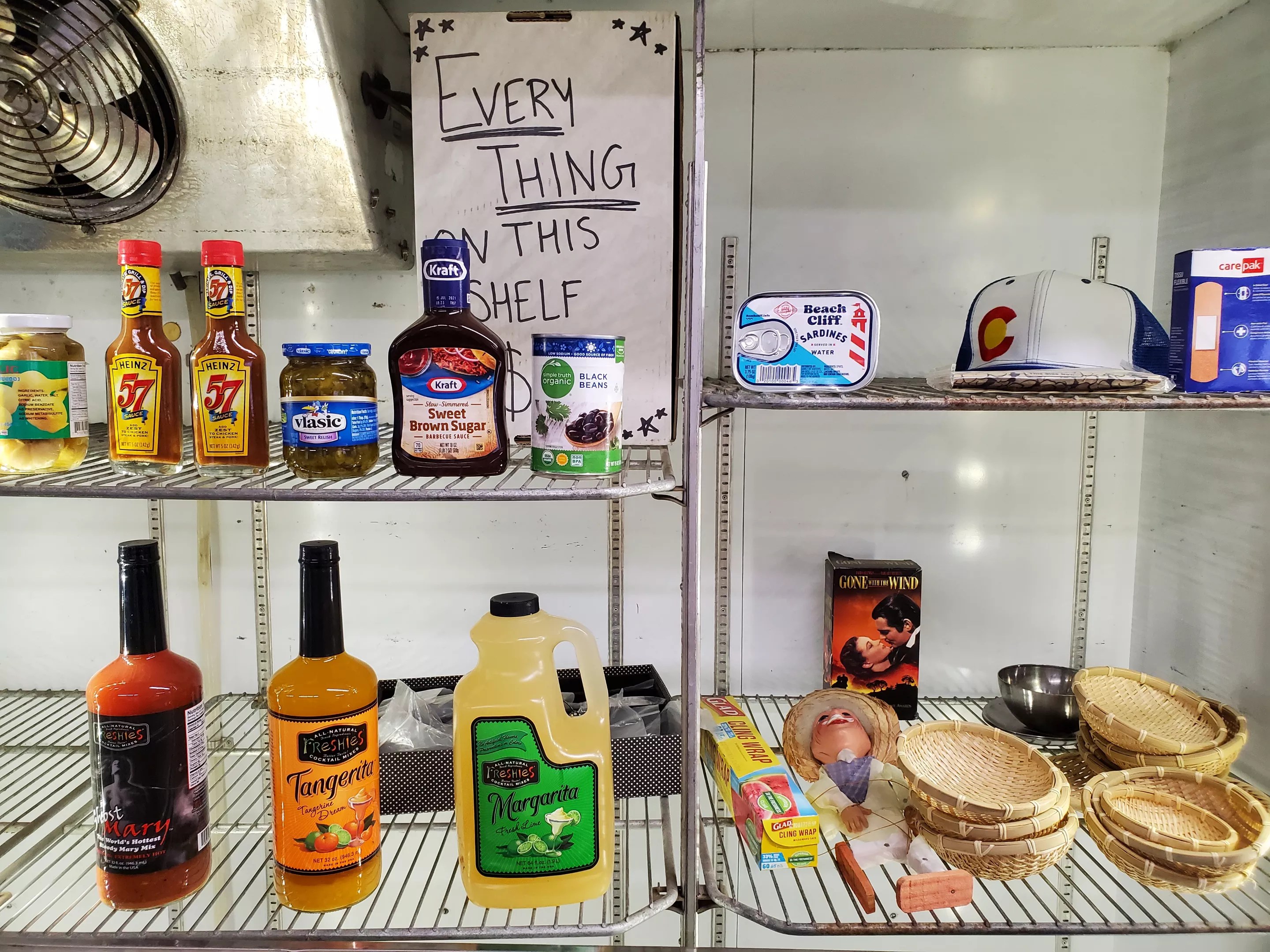 In a mostly empty display case, there’s a sign that reads, “Everything on this shelf $2,” near a random mishmash of items that includes a can of black beans, two bottles of Heinz 57 and pre-made margarita mix.