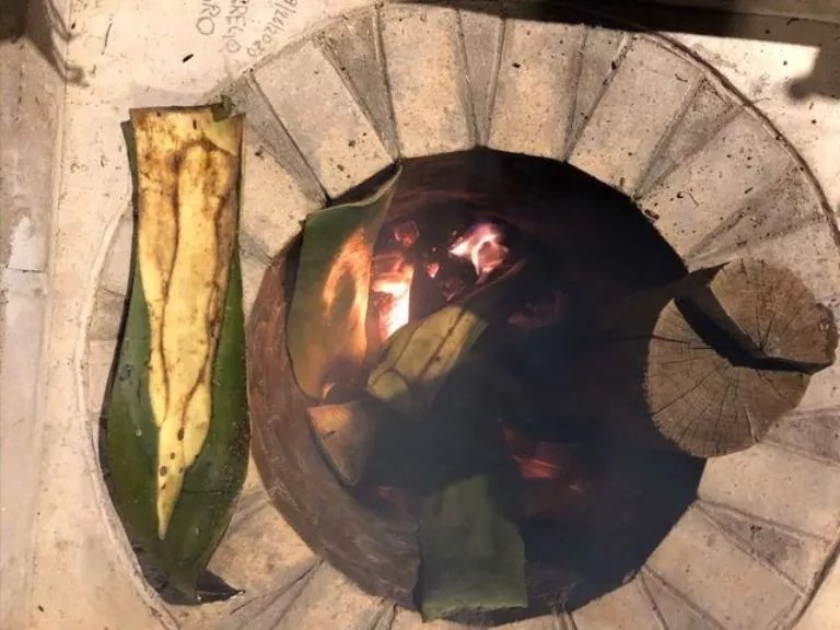 Maguey leaves from Mexico are roasted to soften them before the food is added to the oven.