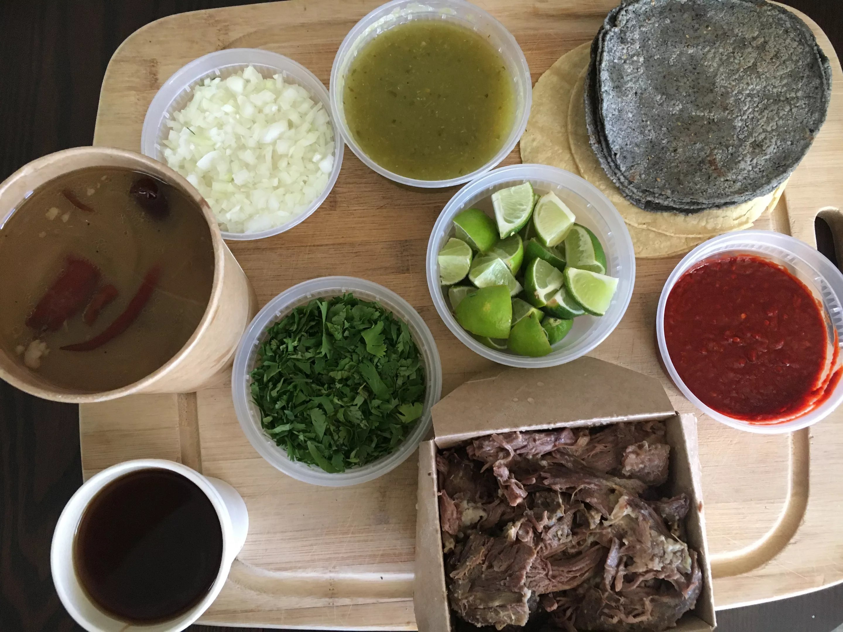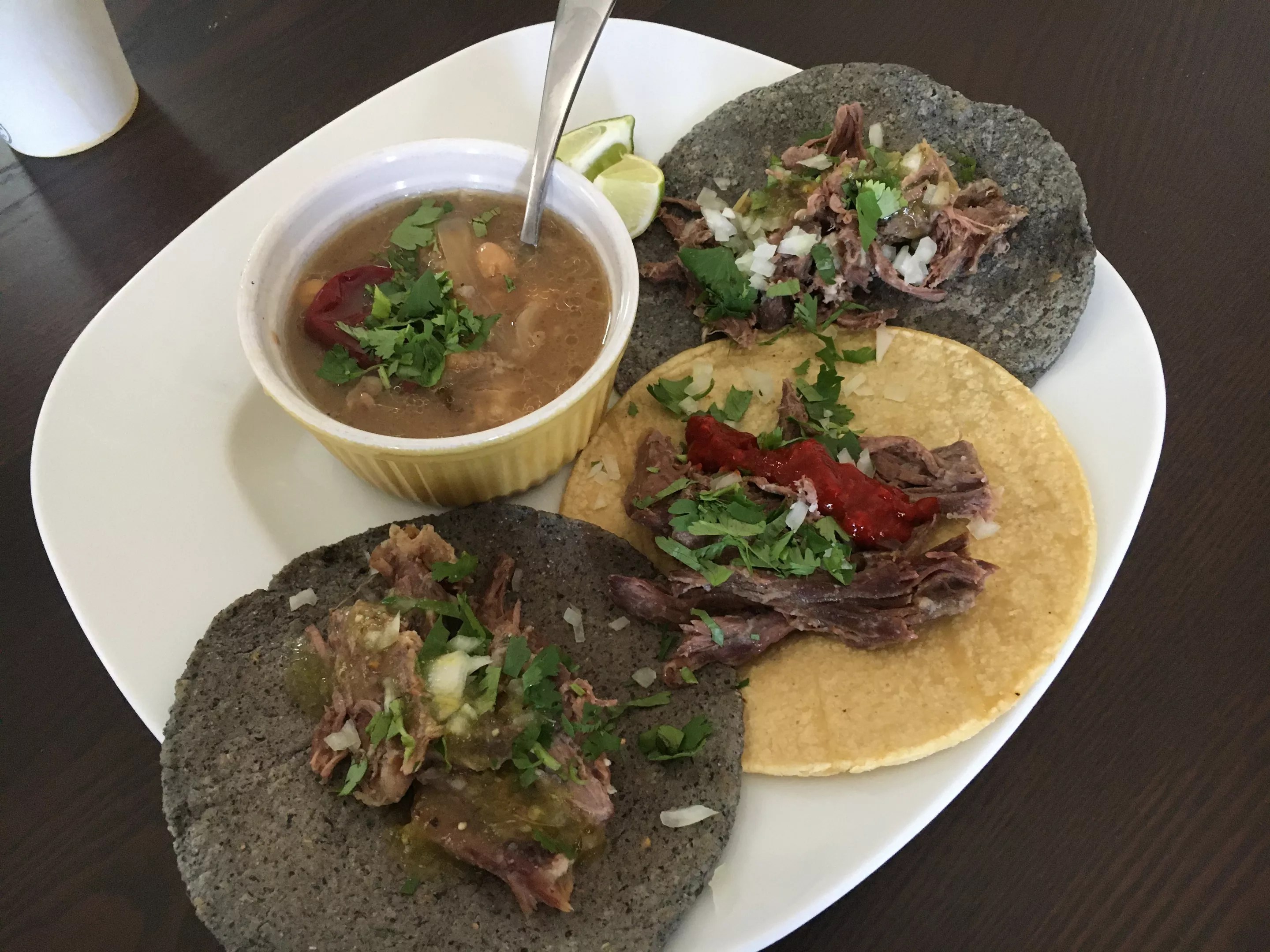 The final tacos de barbacoa assembled and served with hearty consomé.