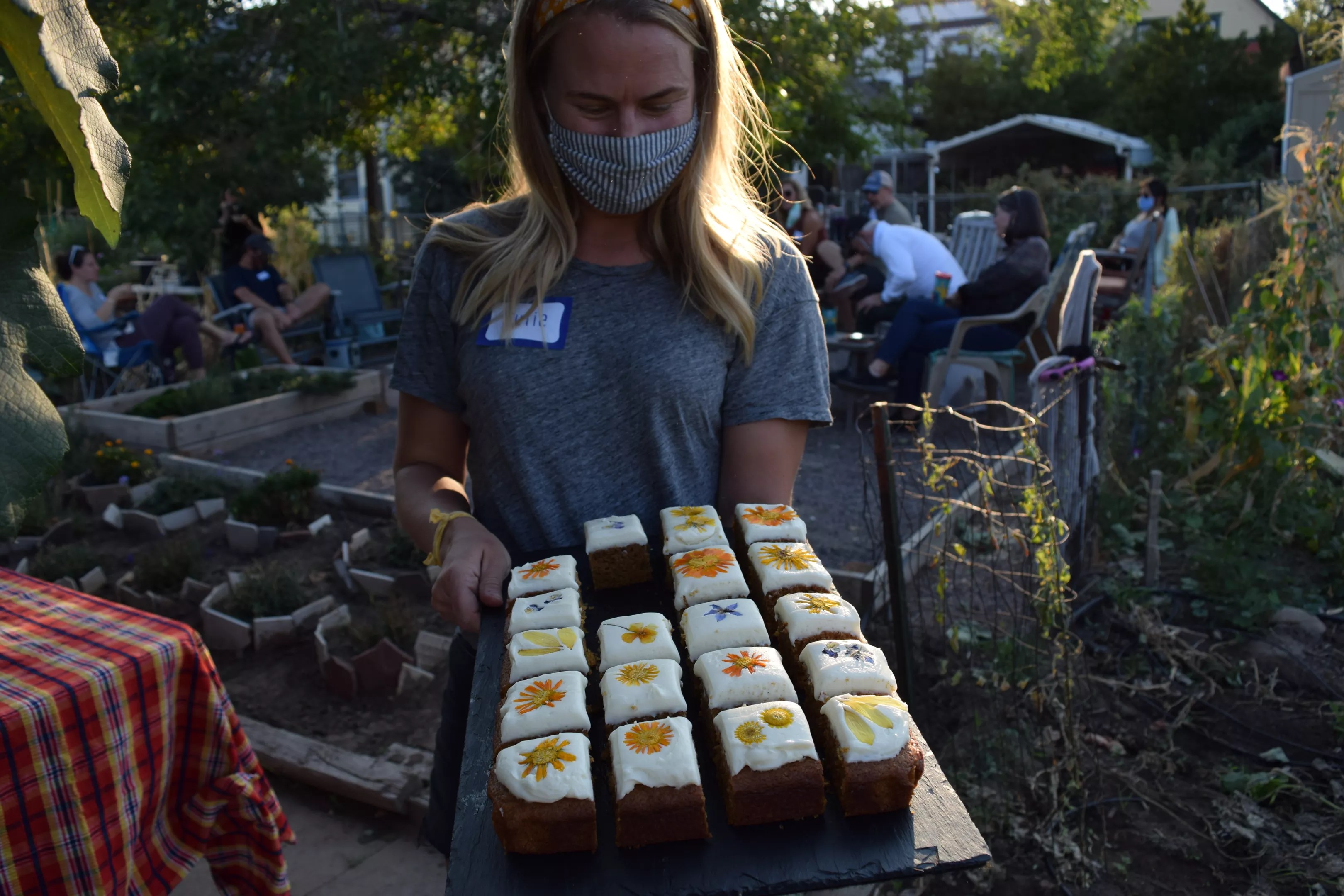 Many brought food to an October 4 potluck made with garden ingredients, including a cake made with edible flowers.
