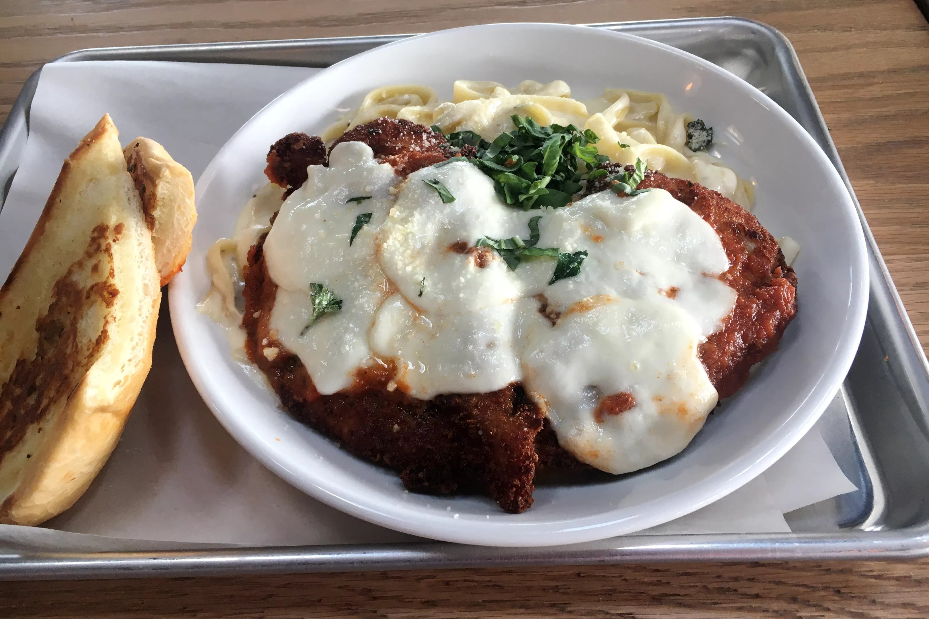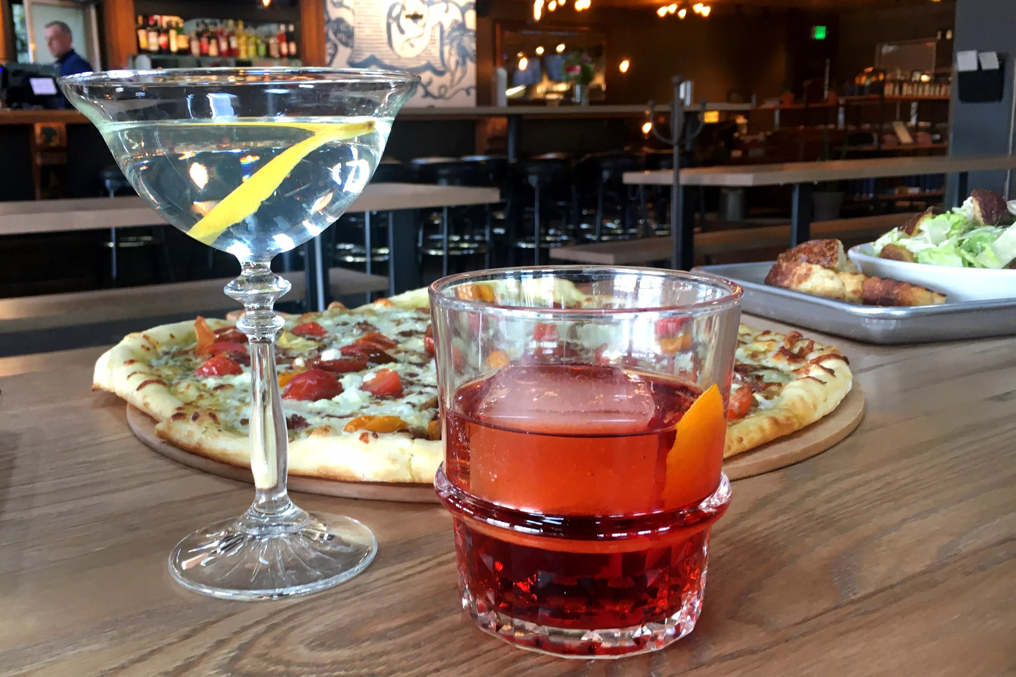 Beyond pizza, there’s Rhode Island-style calamari (fried and finished with sautéed tomatoes and peppers), meatballs in red sauce, chicken parmesan with fettuccine Alfredo, a classic Caesar salad made with real anchovies, and fried ravioli as big as drink coasters. At the bar, cocktails run from trendy Negronis to retro Harvey Wallbangers to a Dark & Stormy punched up with housemade ginger beer, which general manager Brian Mantz says is a signature drink.