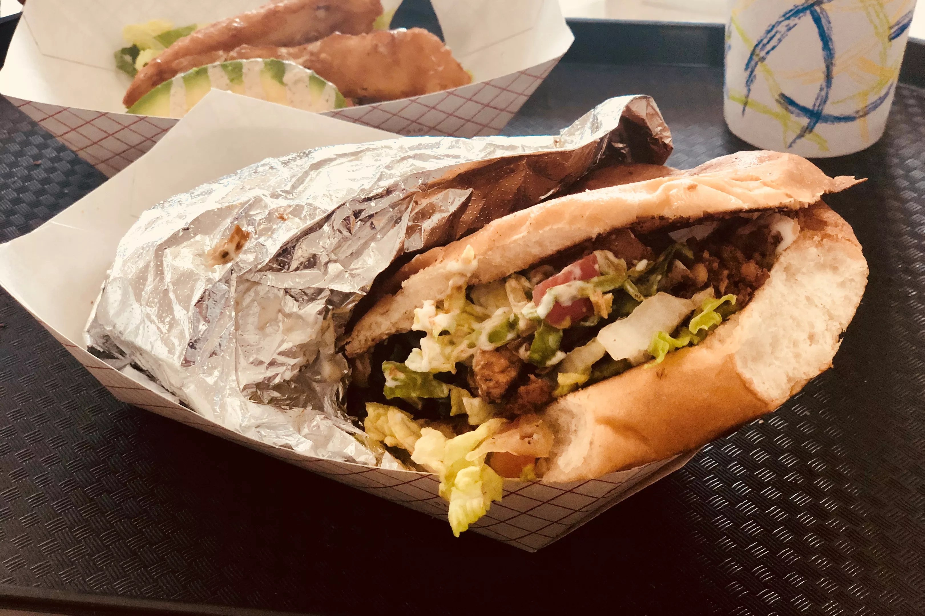 Tortas can be ordered with a choice of several meats; this one is filled with carne al pastor.