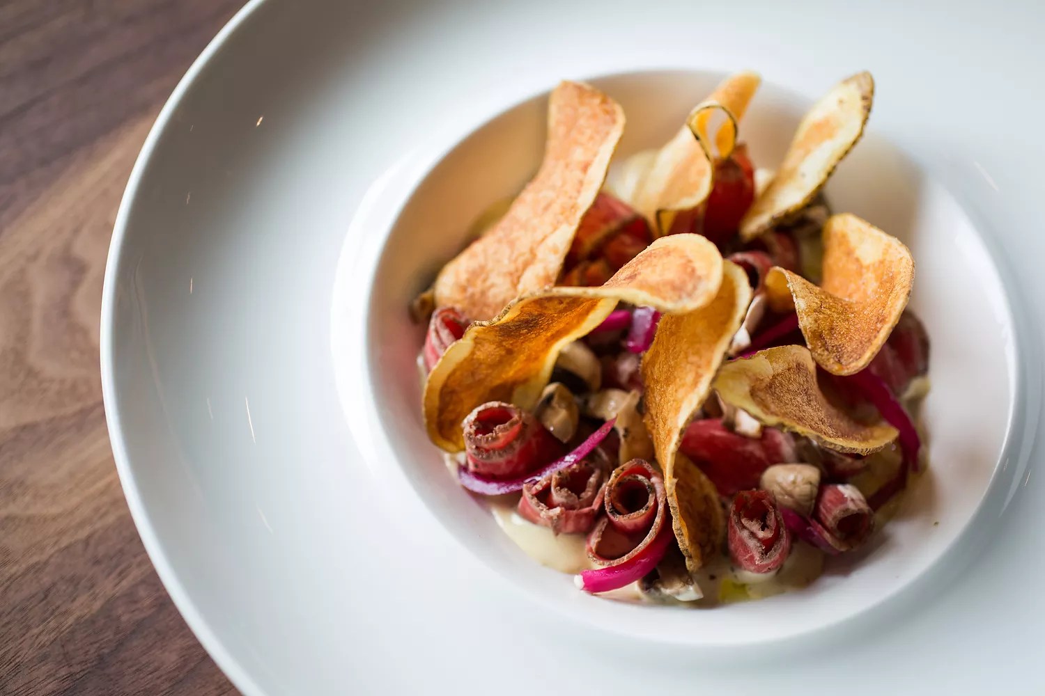 Curls of wagyu beef from 7X Ranch with potato chips and smoked-egg mayonnaise.