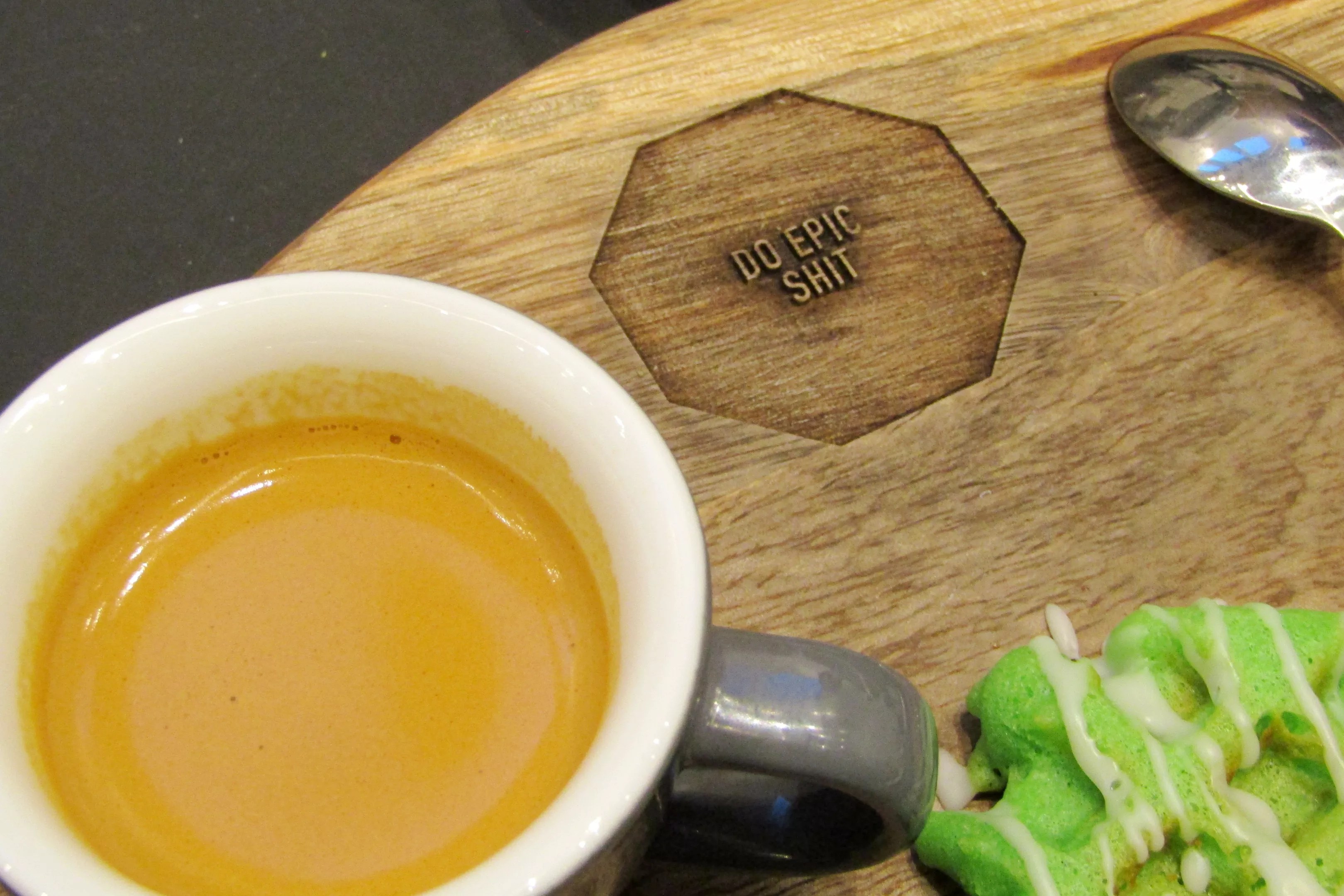 Au Feu An espresso shot and a pandan waffle at Dandy Lion. Mark Antonation