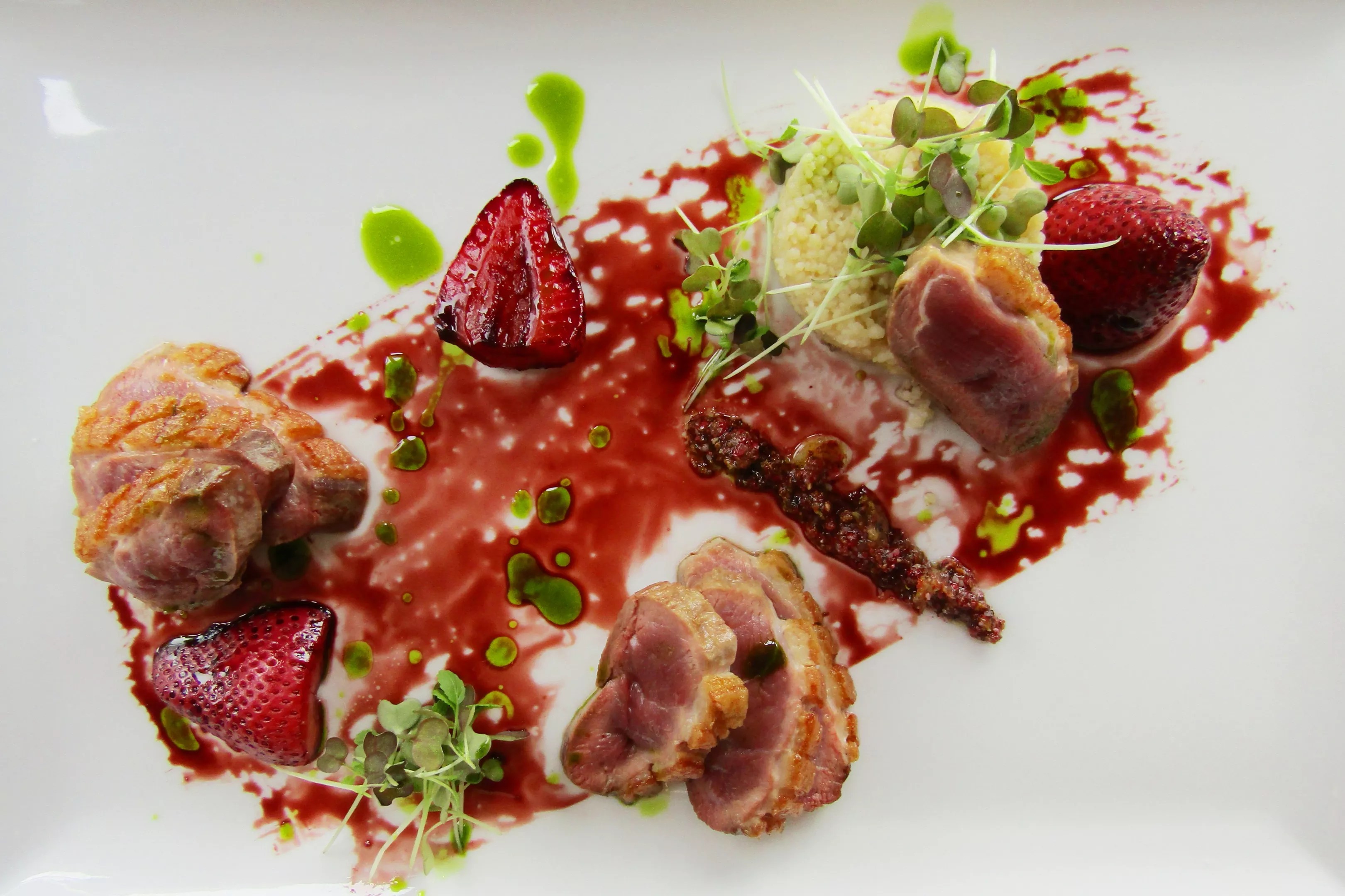 Duck, strawberries and red wine give this plate a bold swath of pinks and reds.