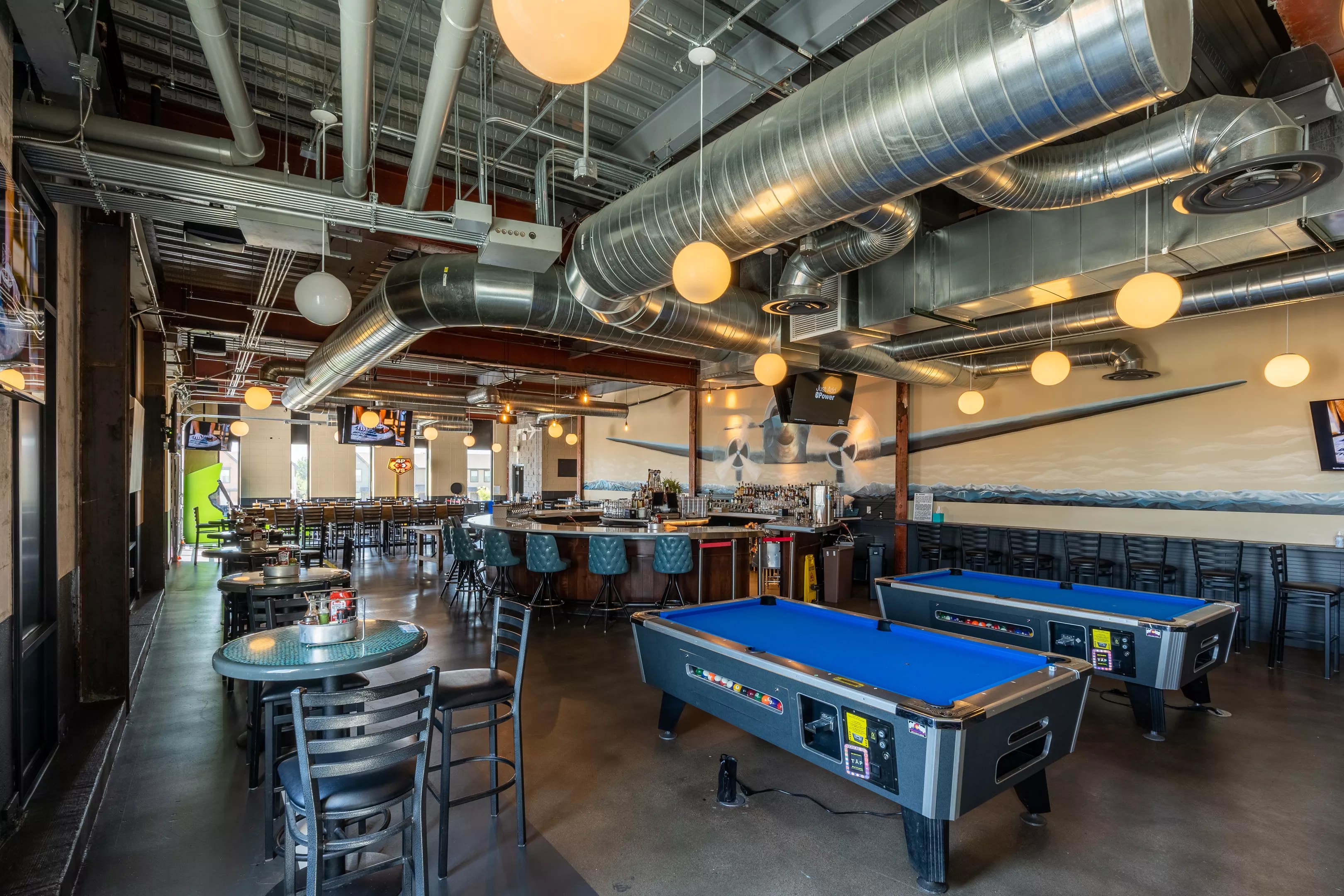 FlyteCo Tower is ambitious and impressive, with an expansive layout, from the busy traditional dining area to the upstairs bar, over to a quieter side nook next to a corner lounge. plus the family-friendly play area outside. Several of these sections are broken up by a couple of bowling lanes in between. Further, a marriage of FlyteCo’s passion for aviation and the natural flight tower building is obvious throughout. The result is as much a feeling of walking through an experience as it is a visit to a local restaurant.