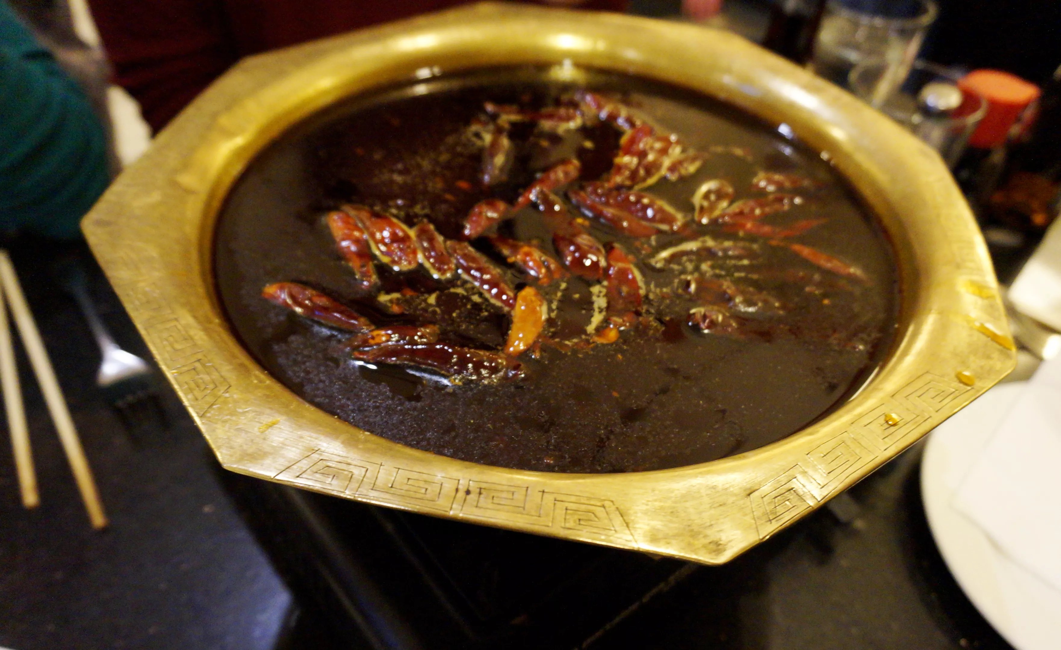 Little Chengdu’s owners actually hail from Jilin province, which sits to the north of the North Korean border, but they’re cooking a broad menu culled from all over the Middle Kingdom. Many of the dishes, like la zi ji ding (or hot and spicy chicken), are hits from Sichuan, but there are also Lanzhou-style noodles and dapanji (big tray chicken), a poultry stew that comes from the northwestern province of Xinjiang. (Legend has it that dapanji was invented by a Sichuan migrant.) Little Chengdu’s hot pot, swimming with chilies. Mark Antonation