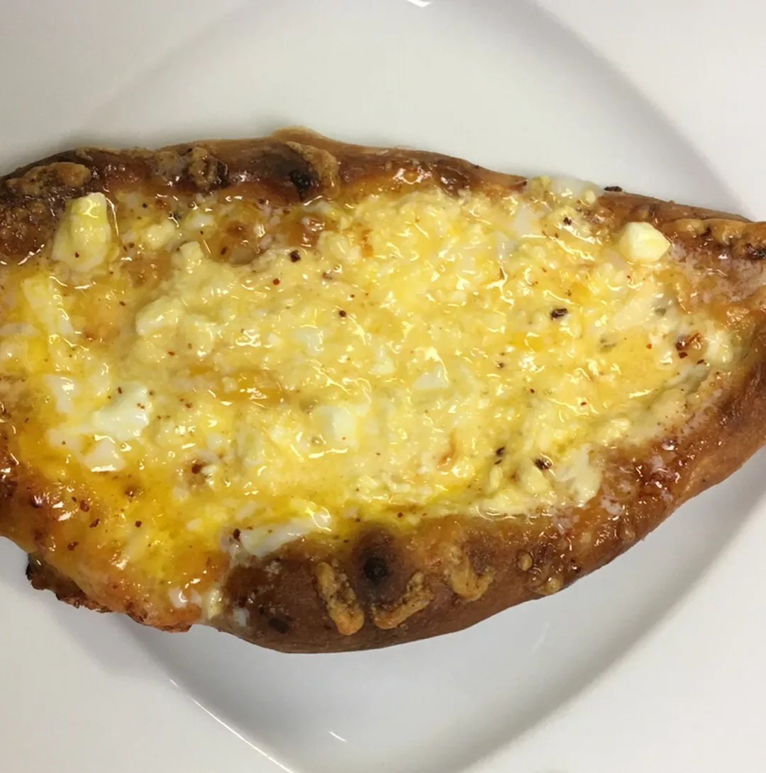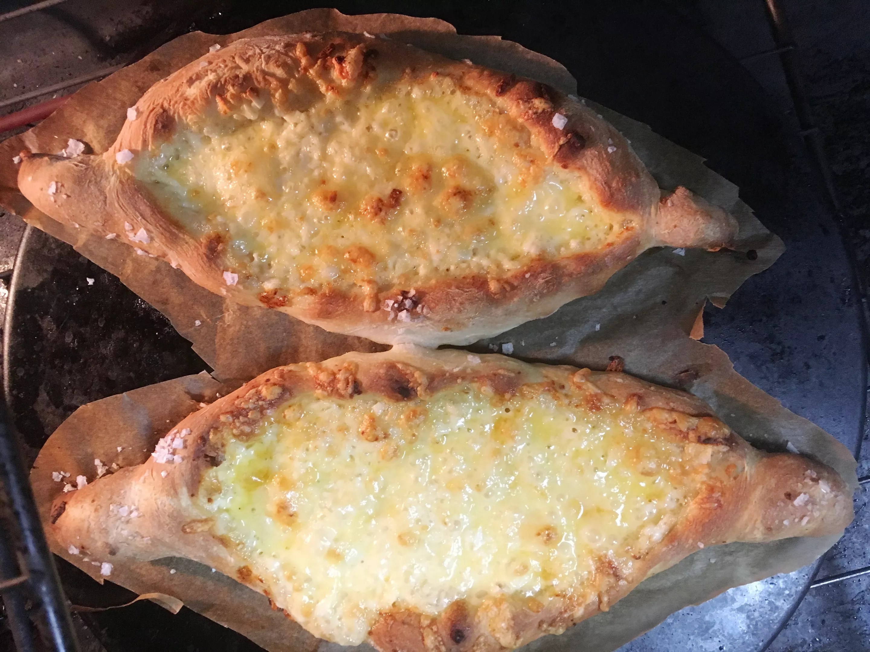 Khachapuri right out of the oven, before eggs are added. You could eat it just like this if eggs aren’t your thing.