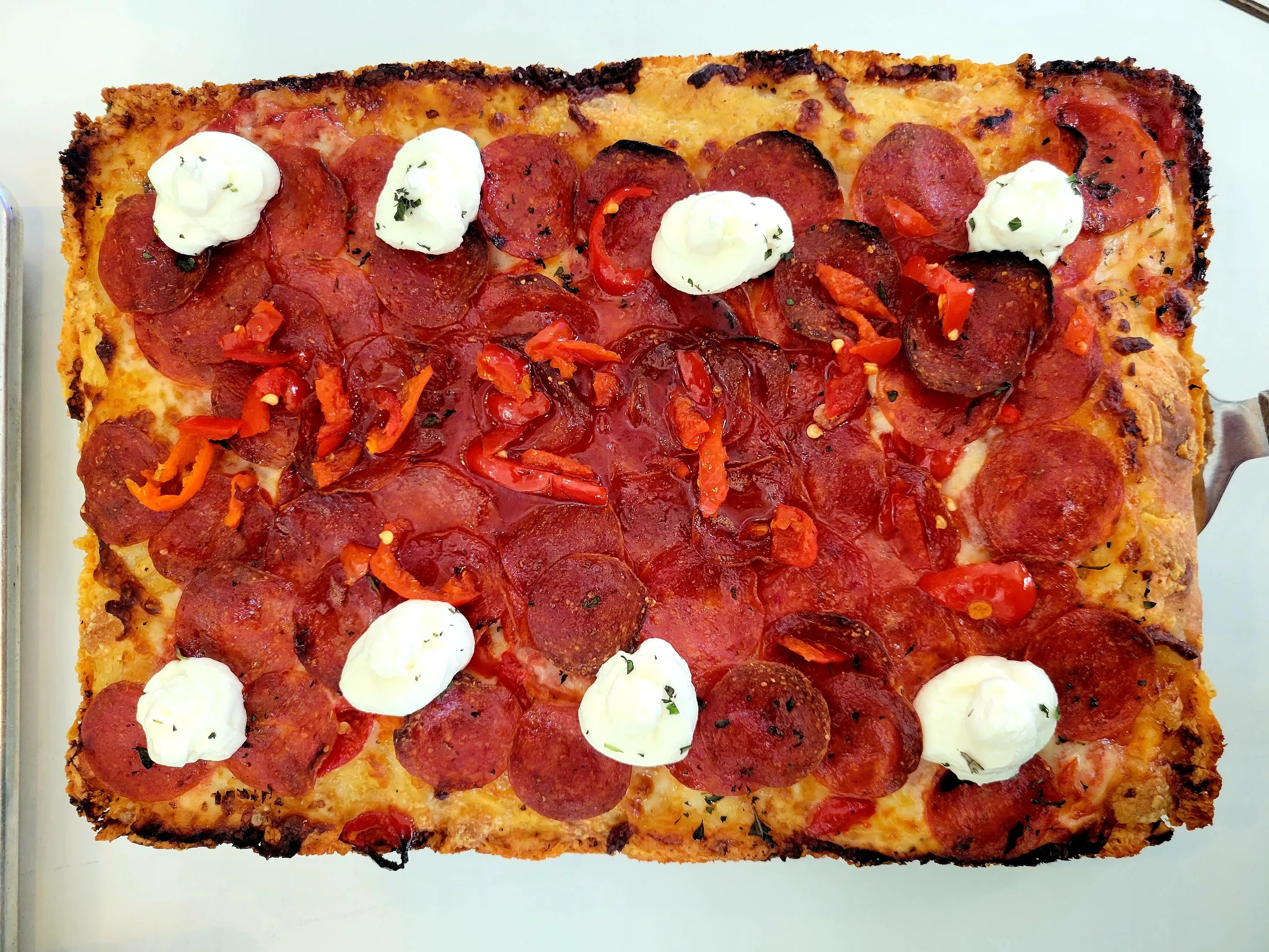 The spicy pepperoni Detroit-style pie at Ghost Box Pizza.