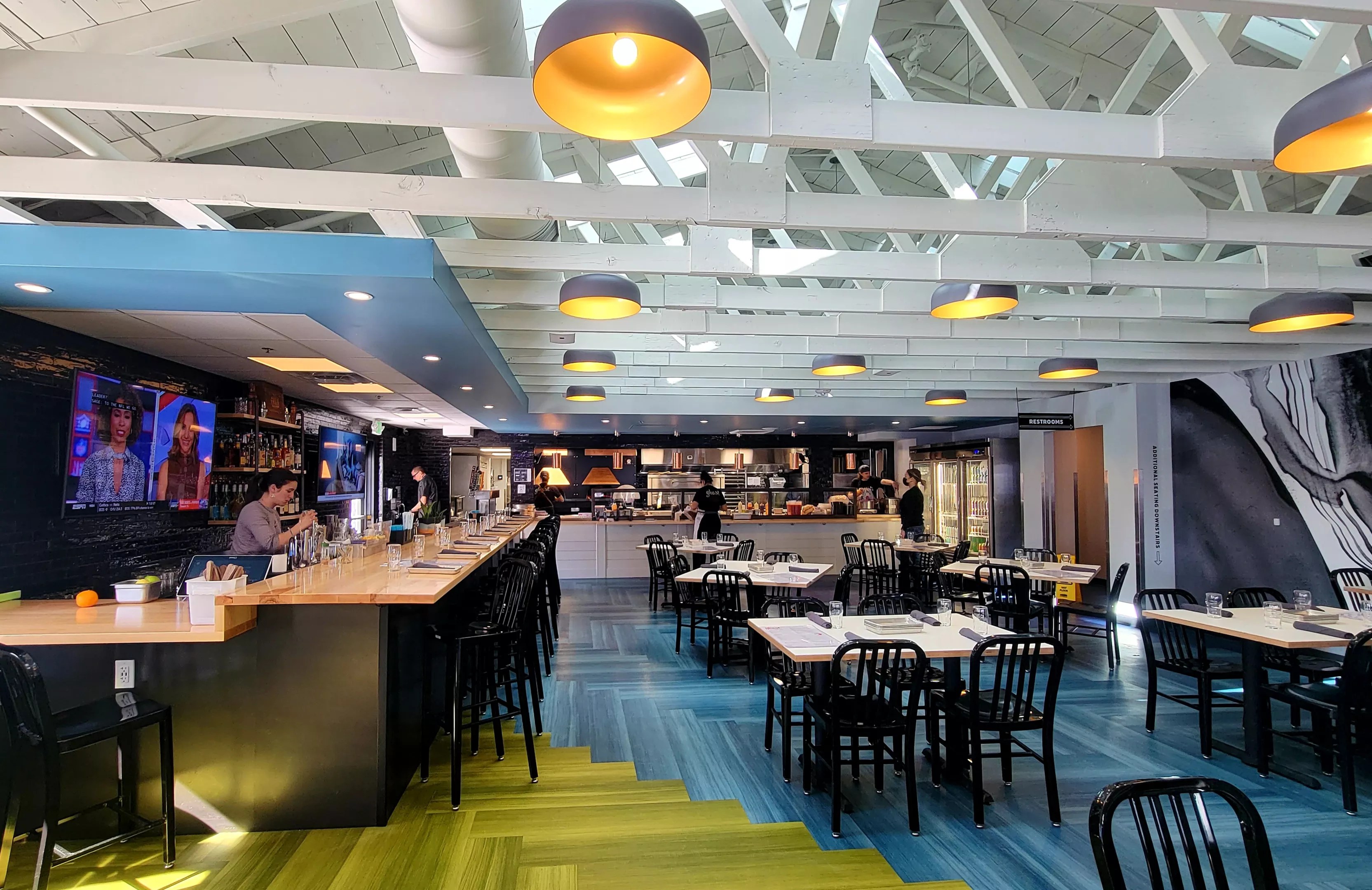 Located in the former Miller’s Bar & Grille, the remodel of the 7,065-square-foot space included opening up the ceilings, exposing the now-white rafters made brighter thanks to skylights in the roof. The stand-alone tables are spaced out so it feels like you have room to move, and a long bar against the wall adds some easy seats for solo diners. The downstairs, complete with televisions and arcade games, is available for large parties and special events.