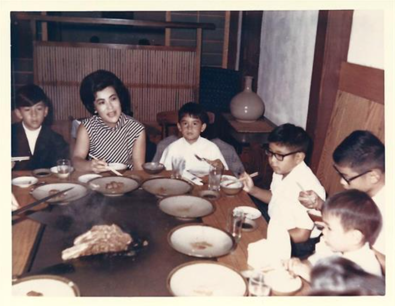 Asakawa family dinner with visiting friends at Benihana in Washington, D.C., about 1968. Ten- year-old Gil is in glasses and white shirt, holding chopsticks.