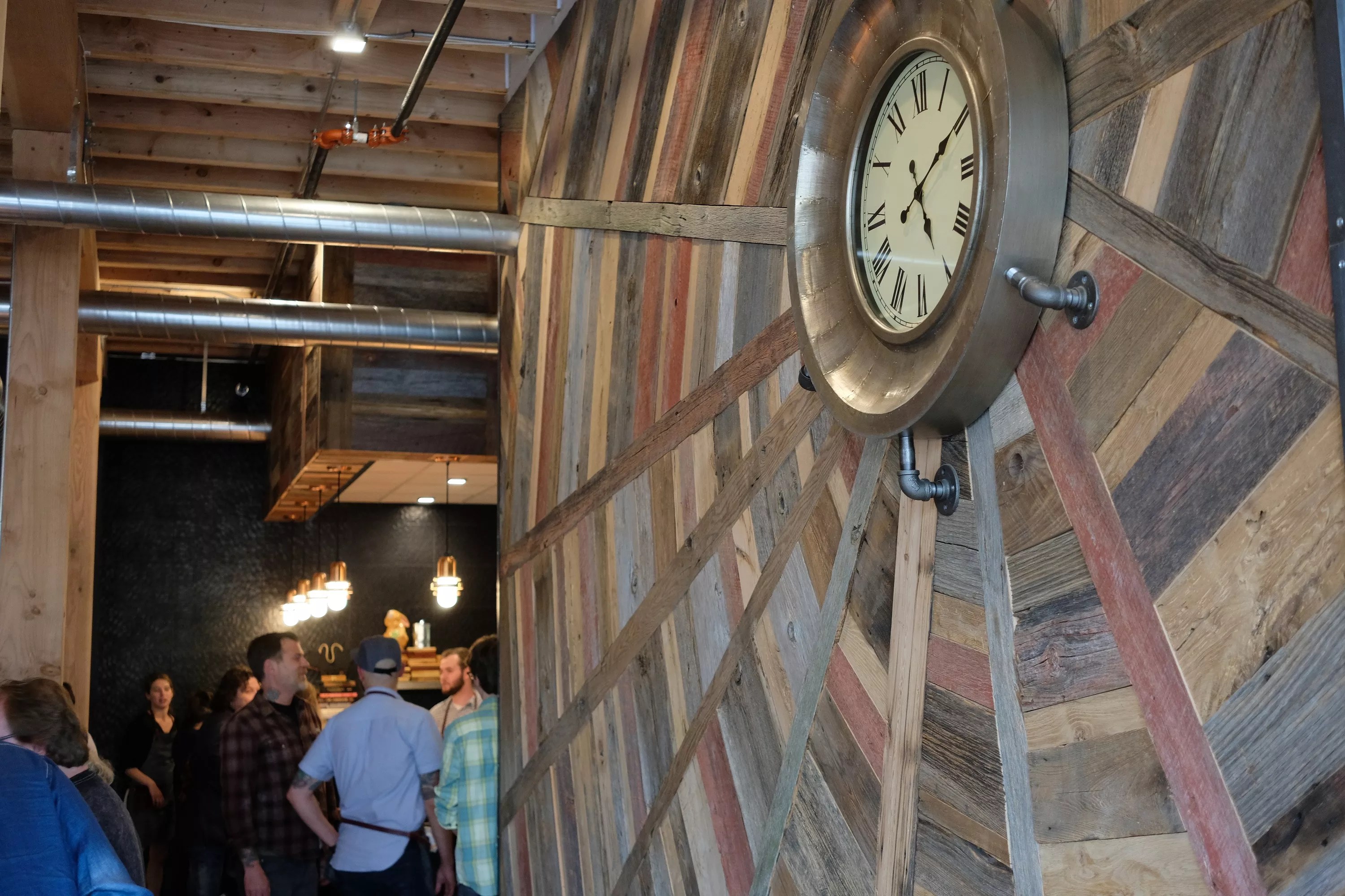 Set inside a 120-year-old brick building with a carefully restored 1930s-era mural on the side, Goed Zuur, which means “good acid” in Dutch, boasts an interior look best described as Steampunk meets European chic. Long tables with elevated platforms for meat-and-cheese boards run along one side, while an artsy clock covers an entire wall on the other. In the middle is a copper-topped bar and custom draft tower made of industrial pipe, wood and lightbulbs.