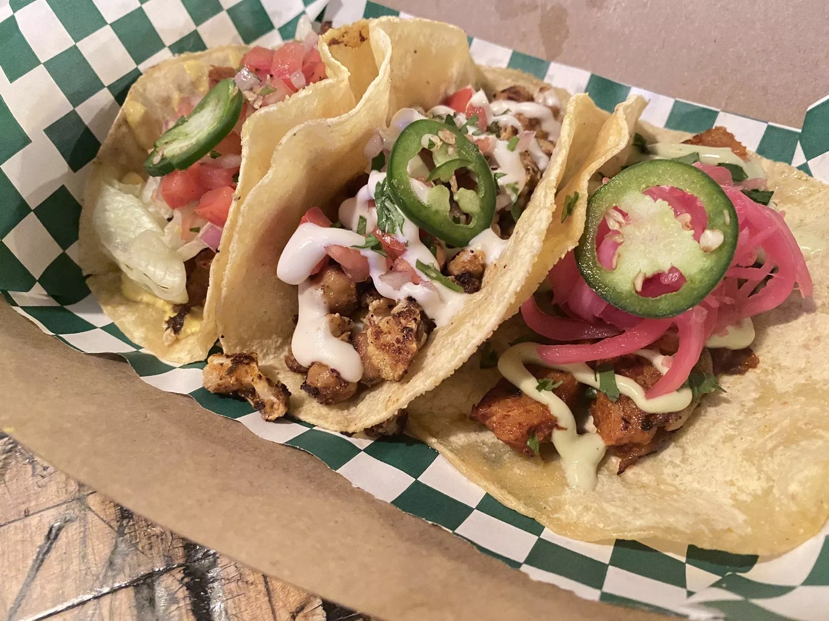 A trio of tacos: Beefy, Chxsten Tinga and Cauli Bam.
