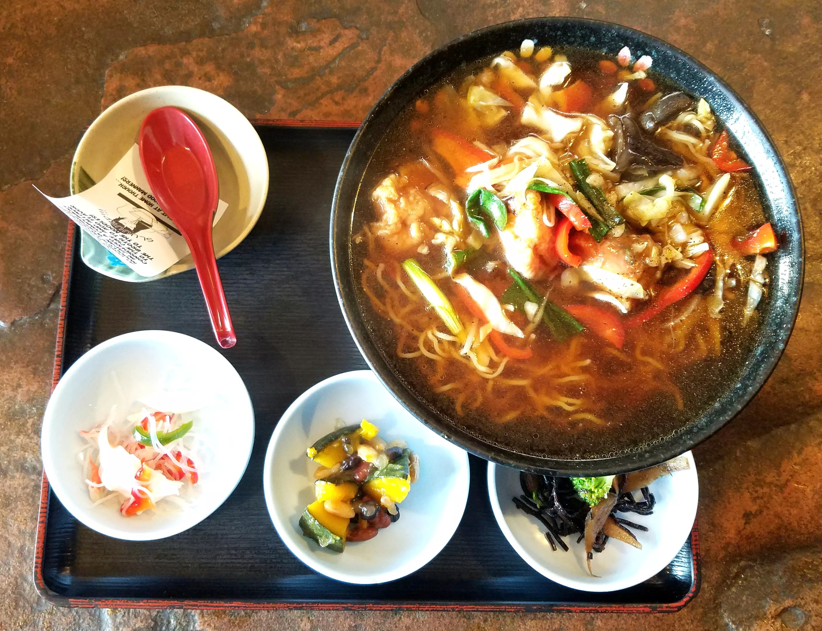 Ace Eat Serve‘s Spice Market Beef Ramen Ramen at Domo comes with Japanese “country” side dishes. Linnea Covington