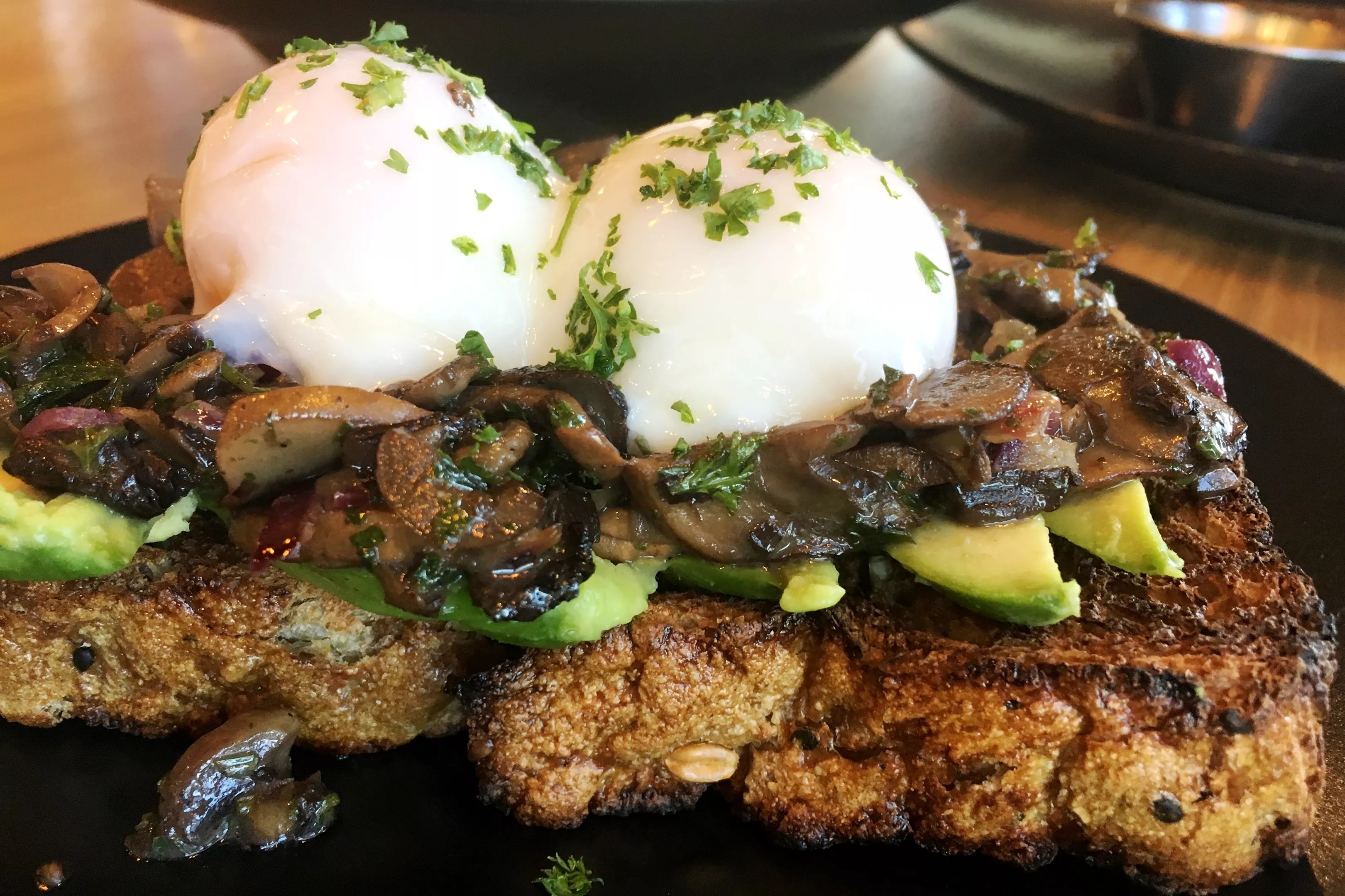 Avocado-mushroom toast with poached eggs on housemade seven-grain bread.