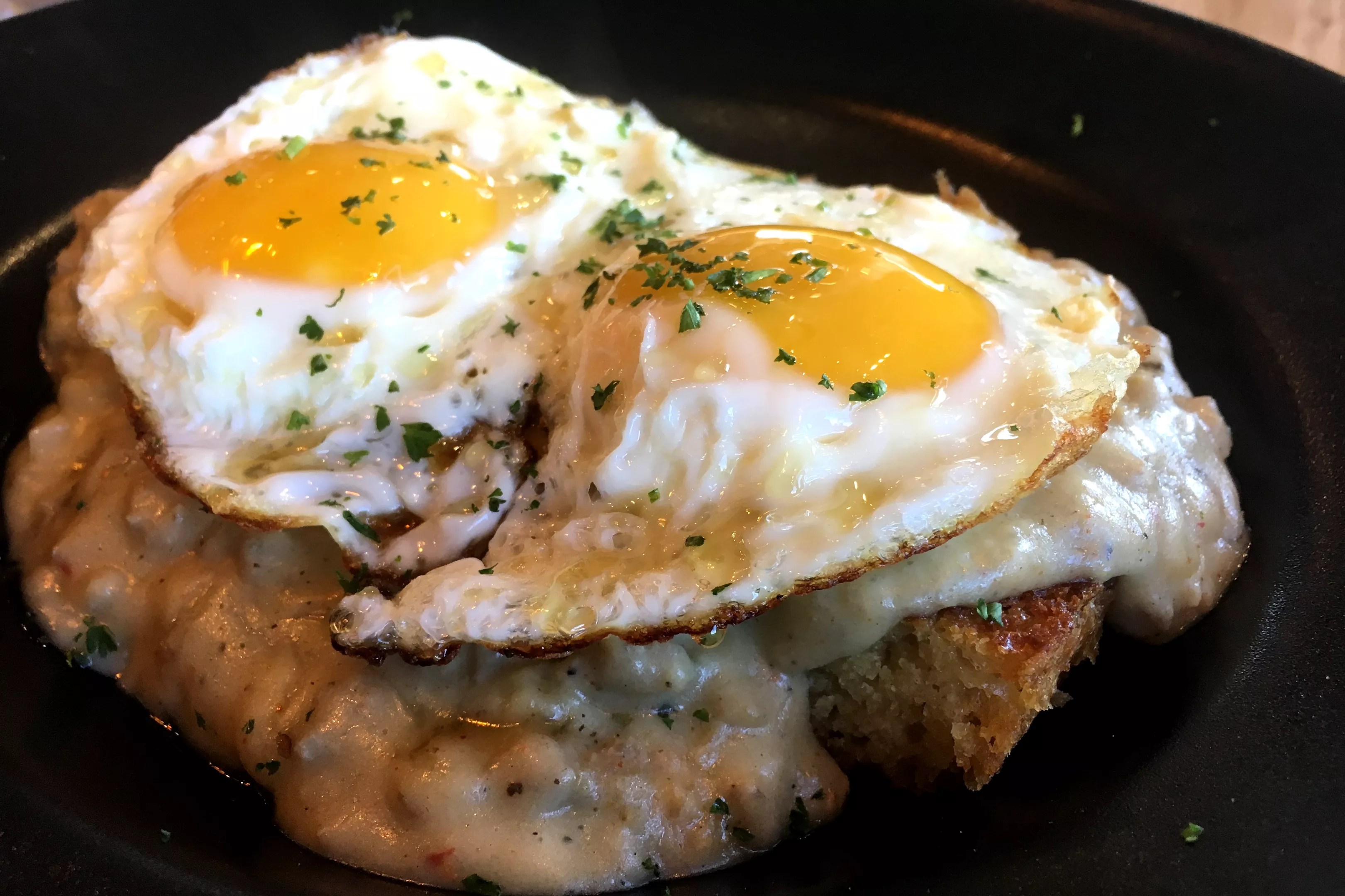Buttermilk biscuits, sausage gravy and fried eggs.