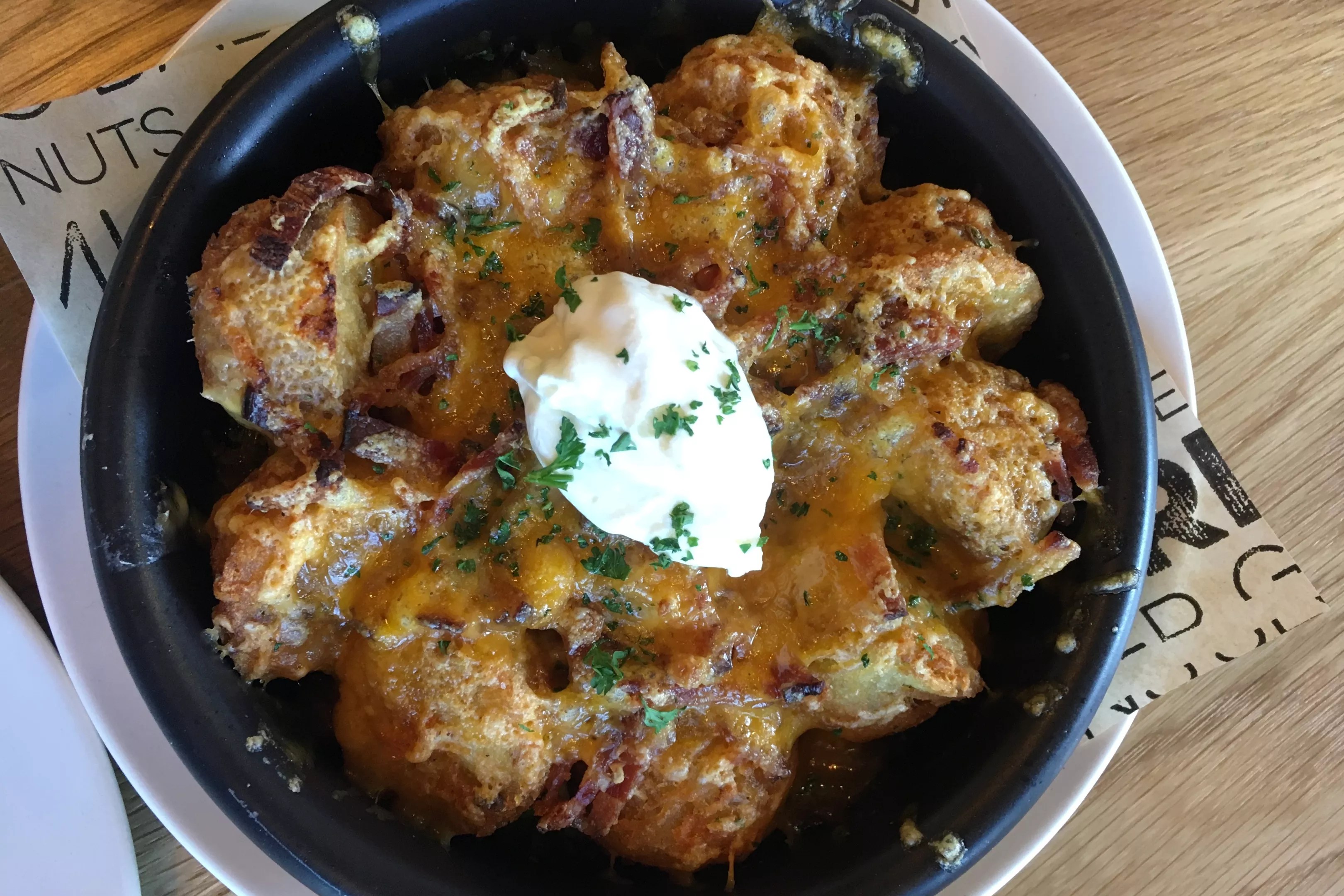Loaded tater tots: bacon cheddar, chives, “mo’nay” sauce and sour cream.