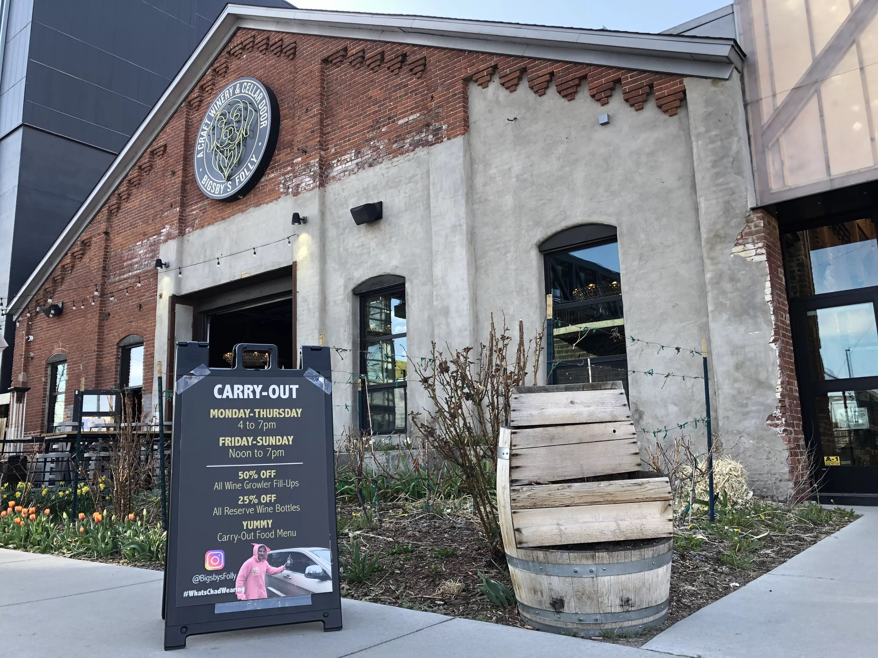 Bigsby’s Folly Craft Winery, at 3563 Wazee Street, is offering carryout and curbside service from 4 to 7 p.m. Monday through Thursday, and noon to 7 p.m. Friday through Sunday (except this Sunday, when the restaurant and bar will be closed for Easter). Visit the winery’s website for text and email instructions.